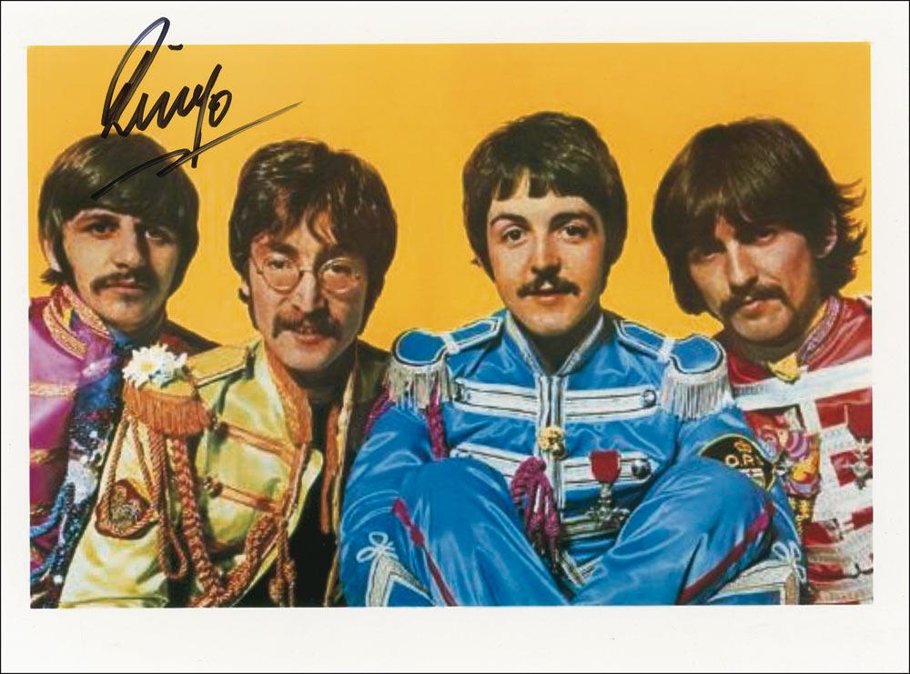 Color glossy 9.5 x 7 photo of the Beatles in their Sgt. Pepper uniforms, signed in black felt tip, “Ringo.” In fine condition, with a few small creases to top portion, not affecting signature or overall image.