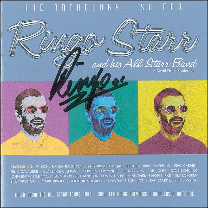 CD booklet for Ringo Starr and his All Star Band Anthology…So Far, signed on the front cover in black felt tip, “Ringo 01.” In fine condition.