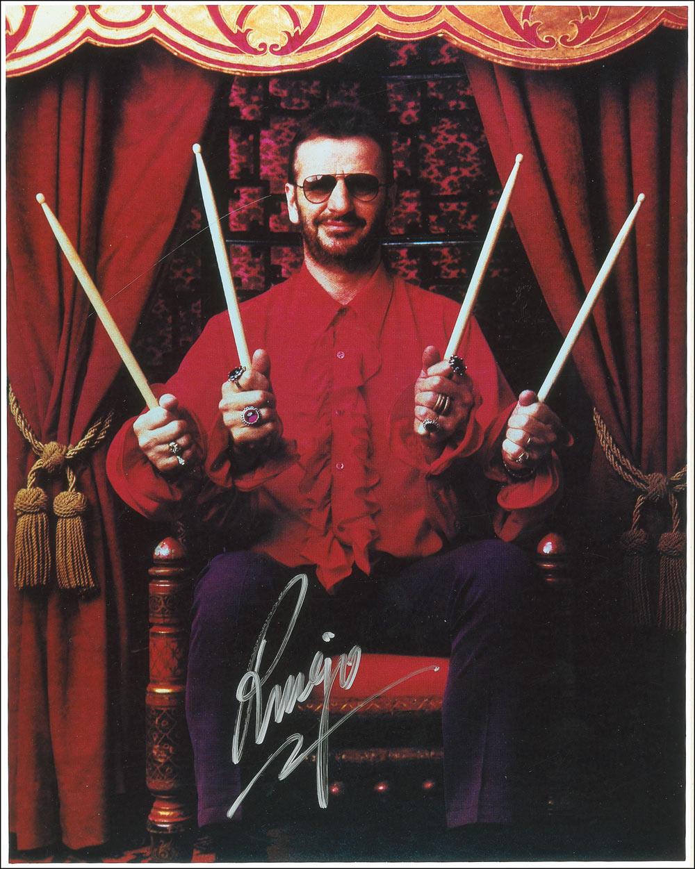Color glossy 8 x 10 photo of the four-handed Ringo holding four drumsticks, signed in silver ink, “Ringo.” Matted to an overall size of 10 x 12. In very fine condition.