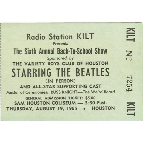 <B>Beatles Sam Houston Coliseum Concert Ticket Stub.</B></I> Beatlemania was running high during these two shows in Houston on August 19, 1965, and the hot weather didn't help much. This ticket stub from the 3:30 p.m. performance is in Very Fine condition with mild wear and tape residue along the top back edge.<BR><BR><b>Shipping:</b> Flat Material, Small (<a target="_blank" href="http://www.heritageauctions.com/common/shipping.php">view shipping information</a>)