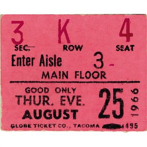 <B>Beatles Seattle Center Coliseum Concert Ticket Stub.</B></I> A stub from the band's August 25, 1966, afternoon concert in Seattle, one of their last live shows. In Very Fine condition with a small amount of edge and corner wear.<BR><BR><b>Shipping:</b> Flat Material, Small (<a target="_blank" href="http://www.heritageauctions.com/common/shipping.php">view shipping information</a>)