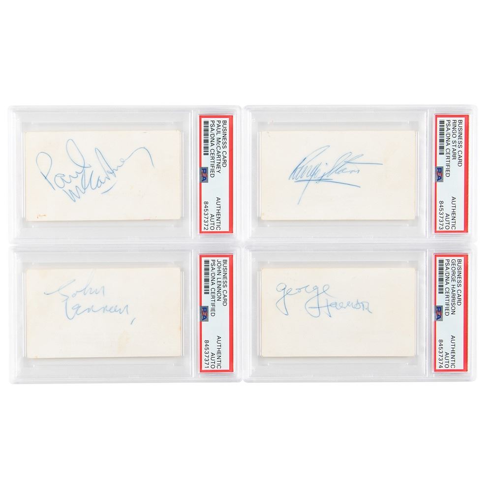 Superb, highly desirable set of ballpoint signatures, "John Lennon," "Paul McCartney," "George Harrison," and "Ringo Starr,†each signed on the reverse of individual off-white 3.5 x 2 Pan American Airways business cards. In overall fine condition, with a faint stain to the Lennon card and subtle haloing to all signatures. Each encapsulated in a PSA/DNA authentication holder.