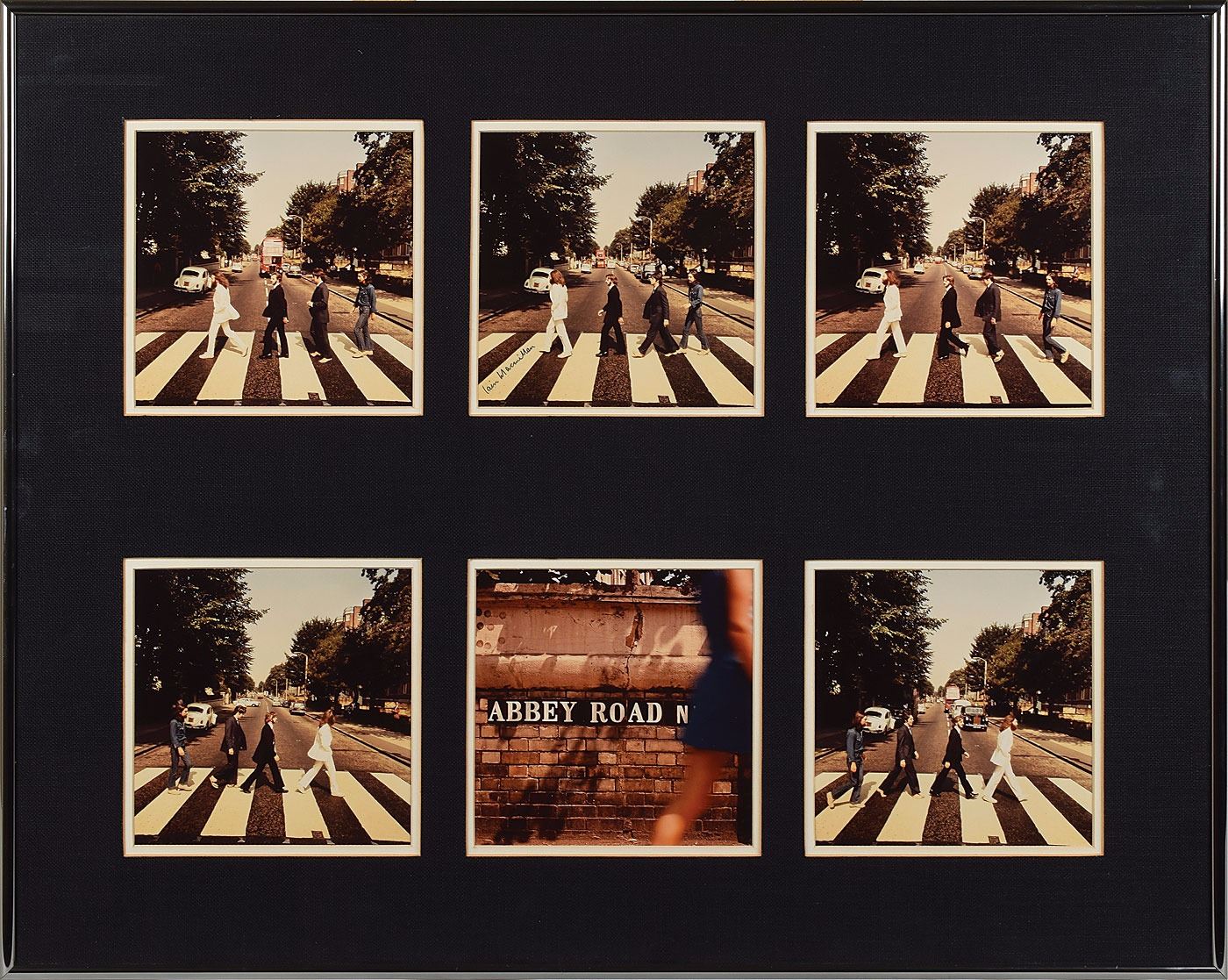 Highly appealing set of five color 'outtake' prints for the cover of the Beatles album Abbey Road. Originally taken by Scottish photographer Iain Macmillan, each print measures 6.5 x 6.5, and shows five unused images of the band walking on the Abbey Road zebra crossing, with Macmillan signing the top center print in black felt tip. Although outwardly similar, with the consistent lineup of Lennon leading and Harrison trailing, the images differ in various subtle ways, including: road traffic, stepping pattern, frame symmetry, and distance between members; additionally, McCartney switches between wearing sandals and walking barefoot. Also included is an original 6.5 x 6.5 print of Macmillan's image for the Abbey Road back cover, which famously shows a girl in a blue dress accidentally walking through the shot. Double-cloth-matted and framed to an overall size of 28.75 x 23. In overall fine condition.