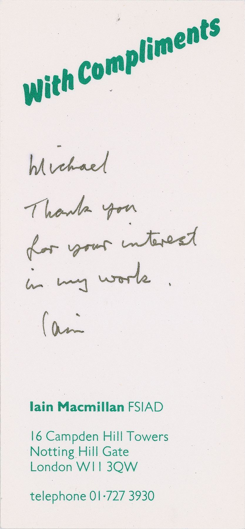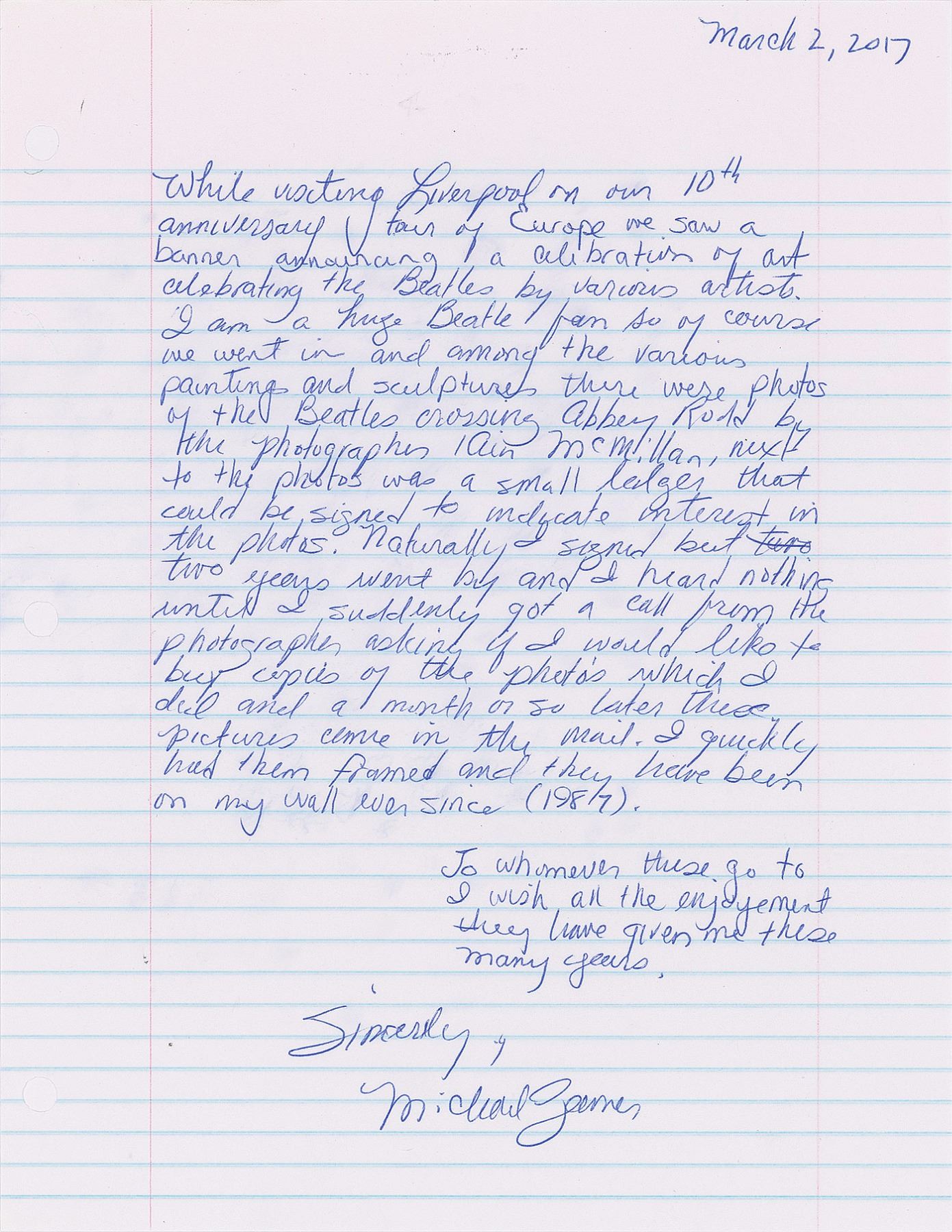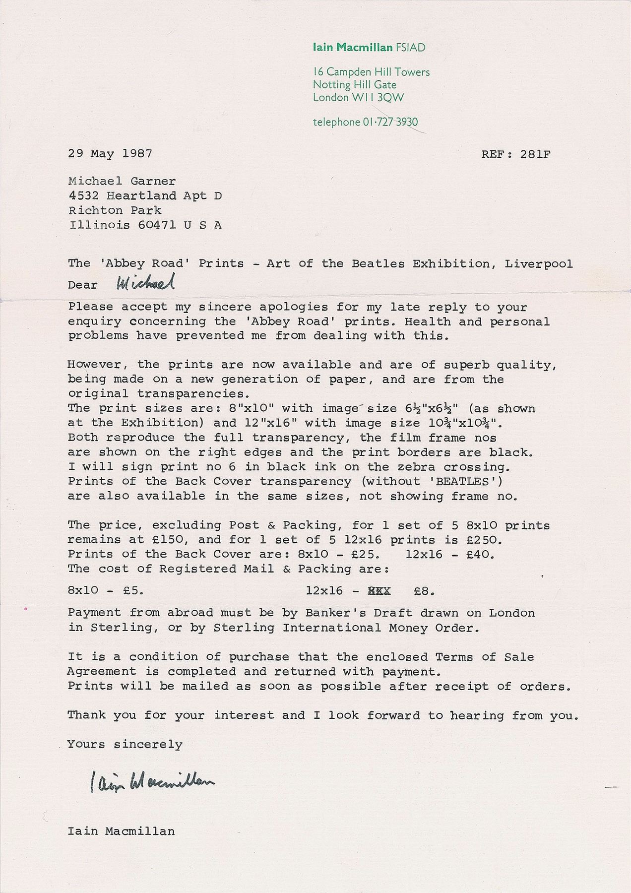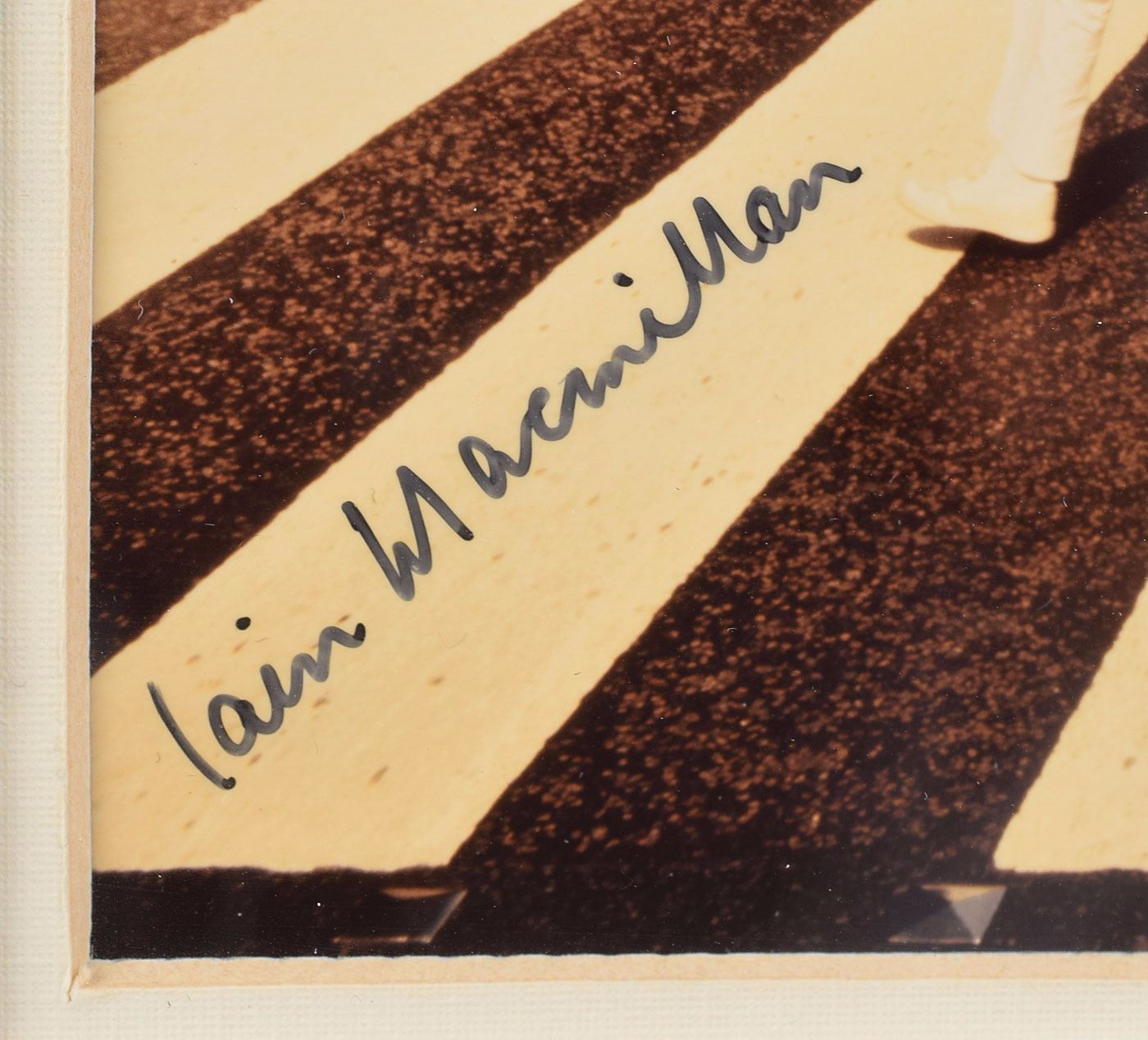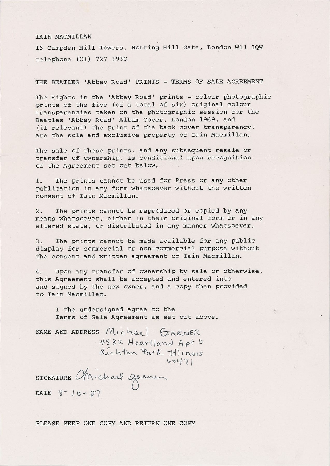 Accompanied by a letter of provenance from the original owner, in part: "While visiting Liverpool…we saw a banner announcing a celebration of art celebrating the Beatles by various artists…Of course we went in and among the various painting and sculptures there were photos of the Beatles crossing Abbey Road by the photographer Iain Macmillan, next to the photos was a small ledger that could be signed to indicate interest…I suddenly got a call from the photographer asking if I would like to buy copies of the photos…and a month or so later these pictures came in the mail." Also accompanied by the original signed letter from Macmillan, regarding interest in the prints, dated May 29, 1987, in part: "The prints are now available and are of superb quality, being made on a new generation of paper, and are from the original transparencies…I will sign print no 6 in black ink on the zebra crossing…It is a condition of purchase that the enclosed Terms of Sale Agreement is completed and returned with payment." Additional accompaniments include: the referenced and signed Terms of Sale Agreement, dated August 10, 1987; a compliments card signed and inscribed to the owner in black ink by Macmillan; a color photo of The Art of the Beatles Exhibition at the Walker Art Gallery, with artwork pricing sheet; and a letter from the Merseyside County Council, dated August 20, 1984.