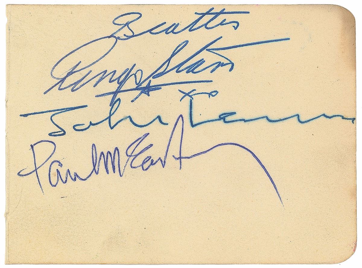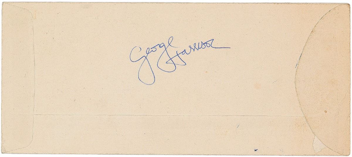 Two items: a set of ballpoint signatures, “Beatles, Ringo Starr, xo,” and “Paul McCartney,” and an ink signature, “John Lennon,” on an off-white 3.75 x 2.75 album page; and a mailing envelope, 9 x 4, postmarked London, September 14, 1967, signed on the reverse in ballpoint, “George Harrison.” In overall fine condition, with a small stain to upper right of album page. Accompanied by a letter of provenance from the friend of the original recipient of the Harrison signature, in part: “Driving through a village called Wyle…I recognized the Magical Mystery Tour bus parked near the Swan Inn…We stopped and went into the pub and chatted with the 4 guys…My mate got George Harrison’s autograph.” Also accompanied by a full letter of authenticity from Tracks for the album page. An appealing full set of Beatles signatures, enhanced by the inclusion of its thrice-signed album page.