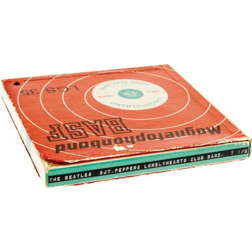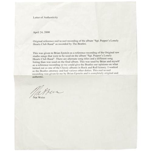 <B>Beatles "Sgt. Pepper's" Master Tape.</B></I> A seven-inch reel-to-reel tape given to Brian Epstein as a reference recording of the original, raw studio songs that were to be used on the Beatles' seminal <I>Sgt. Pepper's Lonely Hearts Club Band</B></I> LP. The tape features alternate song titles and a song listing for the A-side that varies from the one used for the final release (although it was used for the 1987 CD release). This recording was used as a reference by Epstein and Beatles attorney Nat Weiss to give the band feedback in regards to the album, and was later given to Weiss by Epstein as a keepsake. The tape is in Very Fine to Excellent condition, with superb sound quality. <I>Accompanied by a Letter of authenticity from Mr. Weiss.</B></I><BR><BR><b>Shipping:</b> Other (oversized items, group lo (<a target="_blank" href="http://www.heritageauctions.com/common/shipping.php">view shipping information</a>)