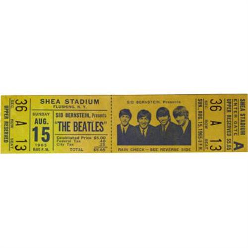 <B>Beatles Shea Stadium Unused Concert Ticket (1965).</B></I> A new world record for a pop concert was created when 56,000 fans attended this legendary outdoor concert, the Beatles' very first stadium show, on August 15, 1965. The Beatles also set a world record with their $160,000 share of the $304,000 box office take. Very few unused tickets to this show turn up; this is a yellow one for the upper reserved seats, in Fine to Very Fine condition with heavy discoloration.<BR><BR><b>Shipping:</b> Flat Material, Small (<a target="_blank" href="http://www.heritageauctions.com/common/shipping.php">view shipping information</a>)