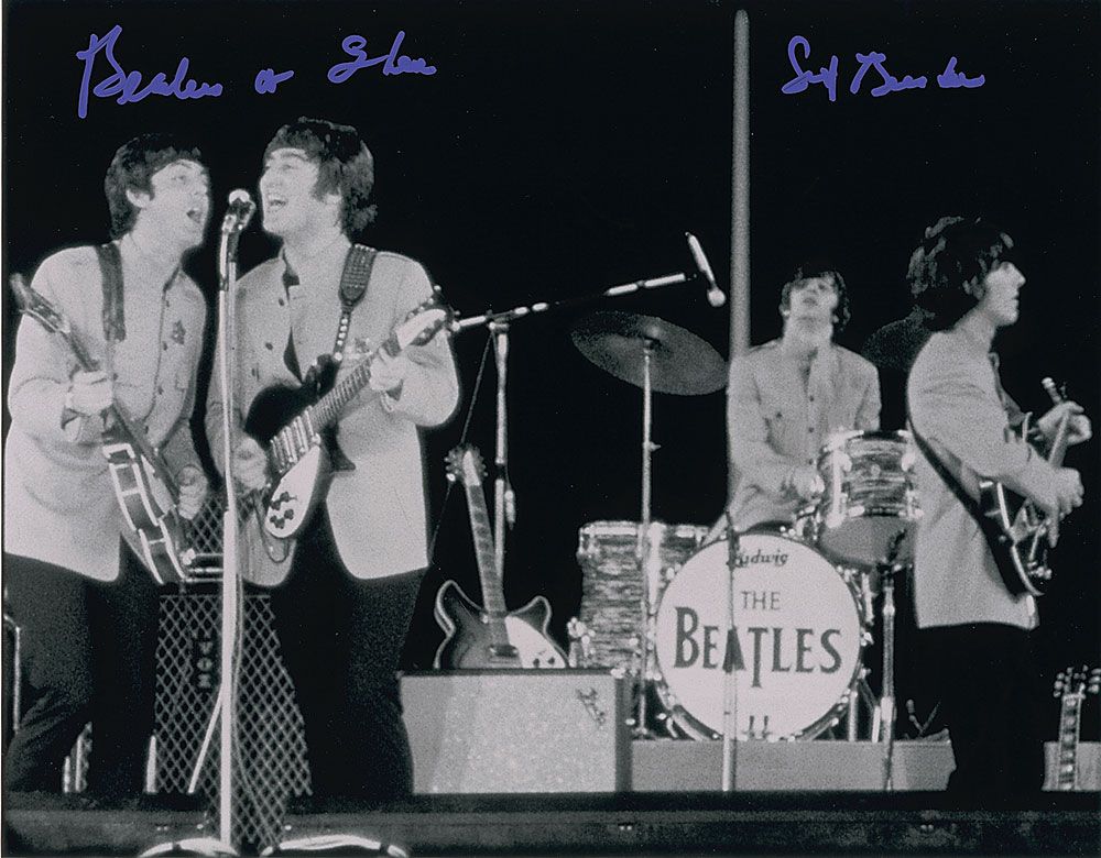 Music producer and promoter who brought the Beatles to Shea Stadium. Glossy 14 x 11 photo of the Beatles on stage at Shea Stadium, signed in purple ink, “Beatles at Shea, Sid Bernstein.” In very fine condition.