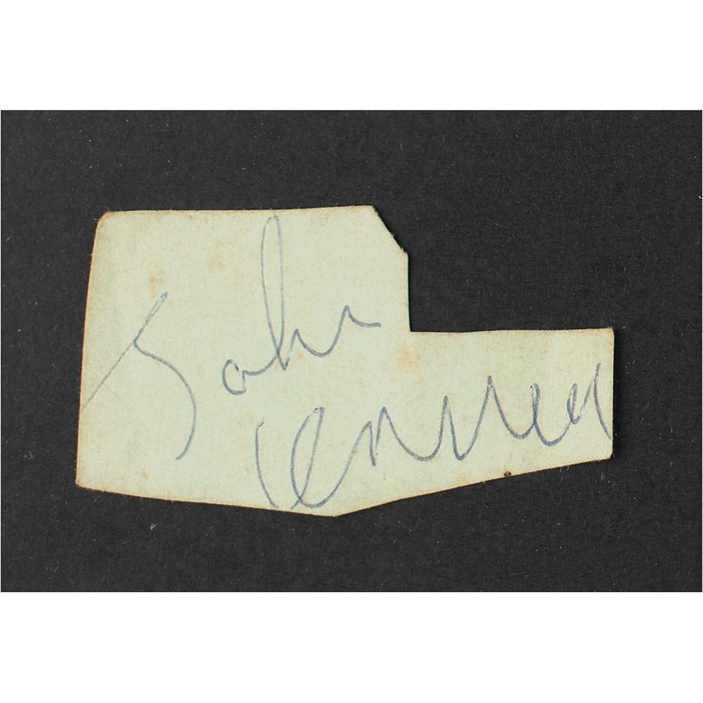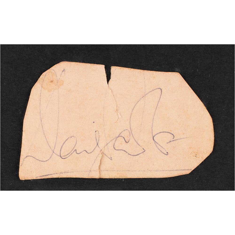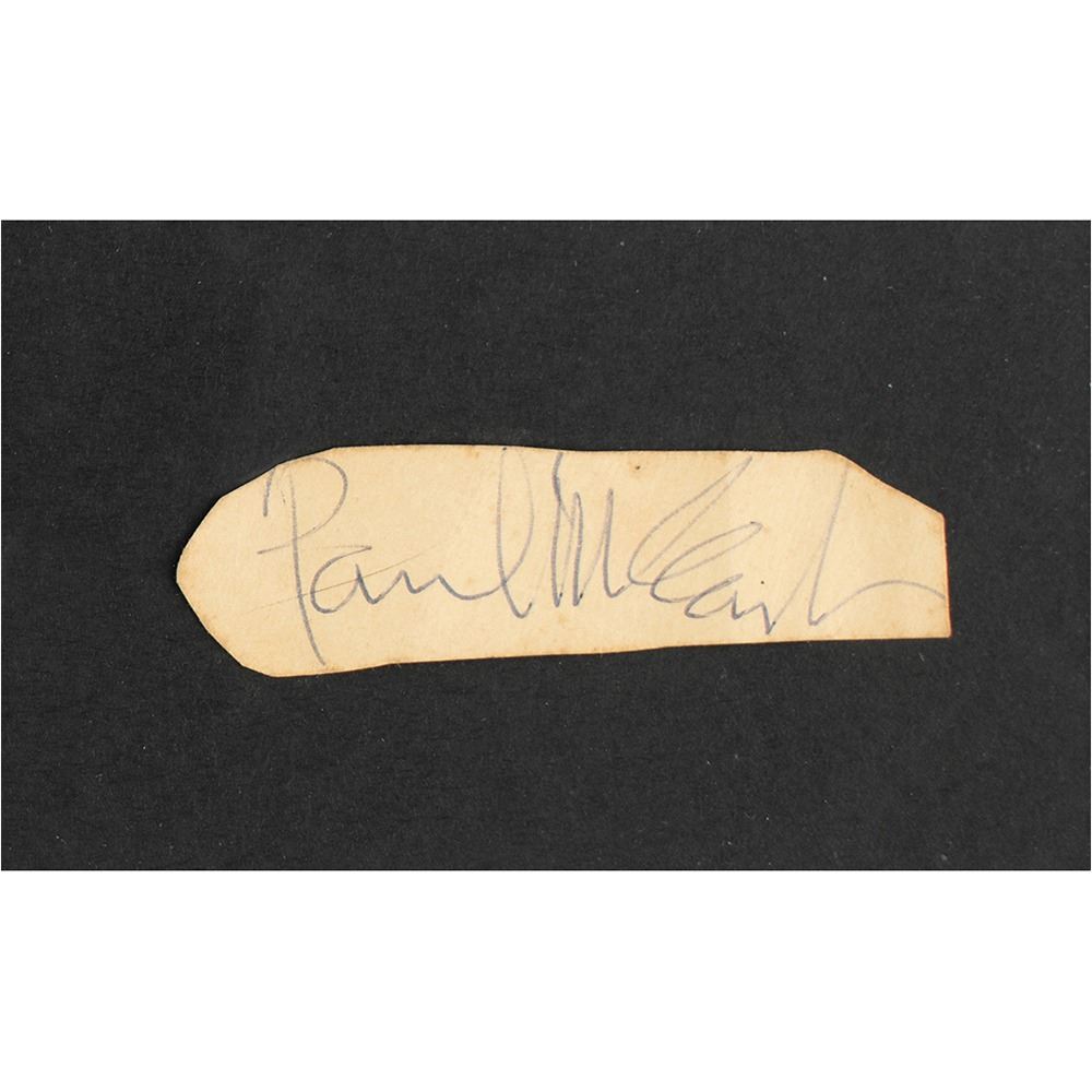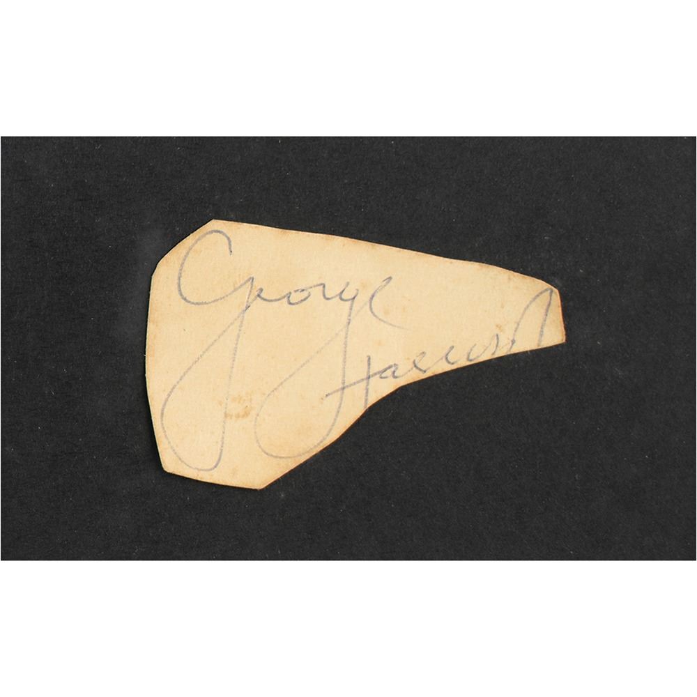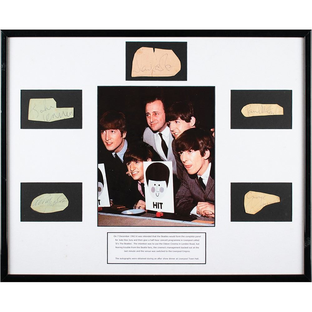 Vintage ballpoint signatures of the Beatles—John Lennon, George Harrison, Paul McCartney, and Ringo Starr—on individual off-white slips ranging in size from 2.5 x 1.25 to 3 x 1.5. The autographs are mounted, matted, and framed with a signature of David Jacobs, the presenter of the BBC Television show Juke Box Jury, a photo of the band with Jacobs, and a provenance caption sheet to an overall size of 21 x 17; the caption sheet reads: “On 7 December 1963 it was intended that the Beatles would form the complete panel for Juke Box Jury and then give a half-hour concert programme in Liverpool called ‘It’s the Beatles.’ The intention was to use the Odeon Cinema in London Road, but fearing trouble from the Beatle fans, the cinema’s management backed out at the last minute and the venue was switched to the Liverpool Empire. The autographs were obtained during an after show dinner at Liverpool Town Hall.” In very good to fine condition, with light creasing and soiling to each slip.
