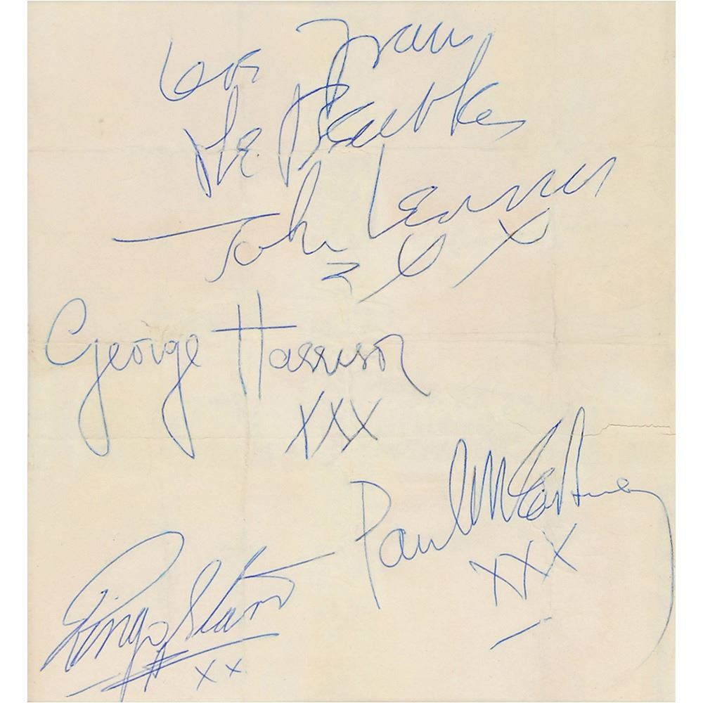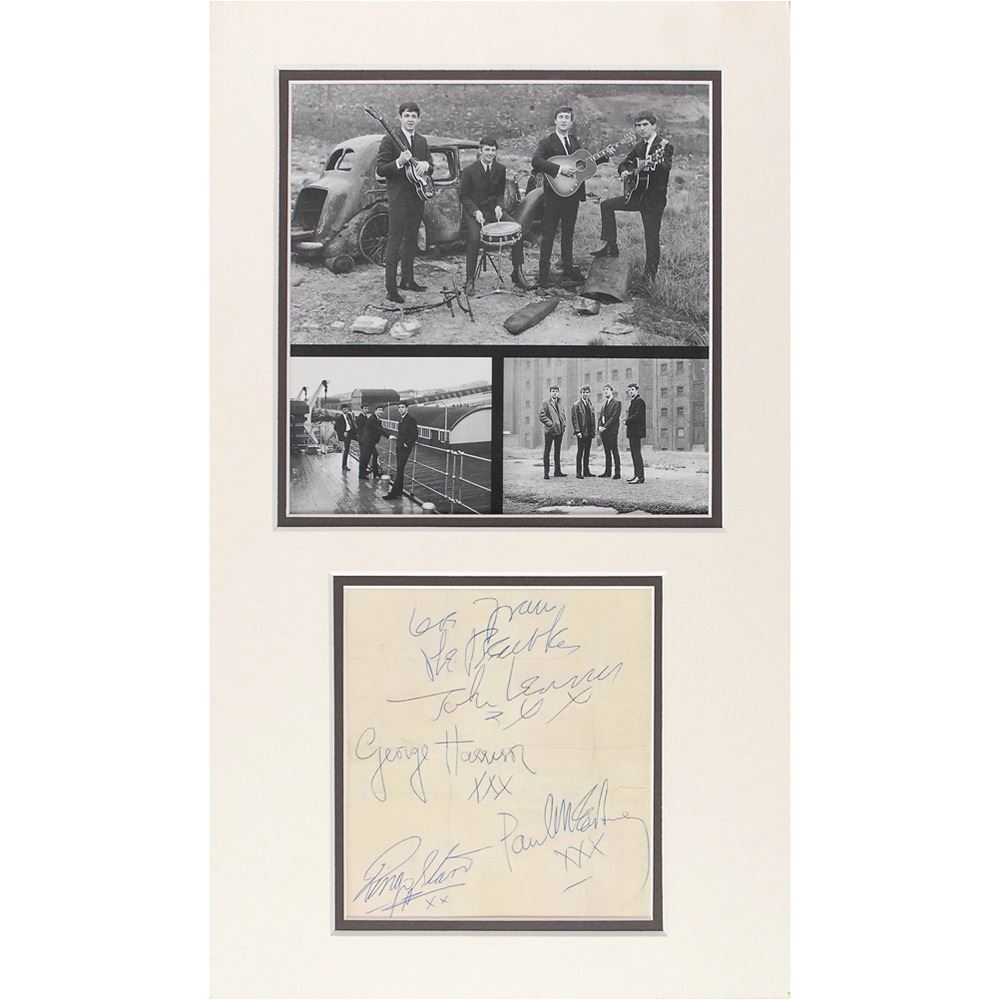 Vintage circa mid-1963 ballpoint signatures, "Love from the Beatles, John Lennon xxx," "George Harrison xxx," "Ringo Starr xxx," and "Paul McCartney xxx," on an off-white 5.5 x 6 sheet. Sheet is affixed to a sheet of heavier cardstock and double-matted with a composite photo of the band to an overall size of 12 x 20. In very good condition, with overall creasing and multiple intersecting folds. Accompanied by a letter of authenticity from noted Beatles expert Frank Caiazzo, which dates the signatures to mid-1963. A visually-striking large and uninscribed set of signatures obtained as the band's commercial success would soon bring them worldwide exposure.