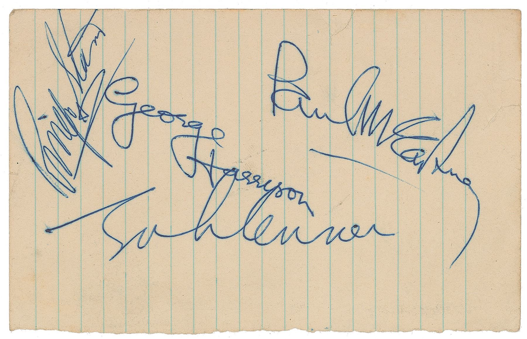Bold full set of vintage ballpoint signatures, "John Lennon," "Paul McCartney," "George Harrison," and "Ringo Starr,” on an off-white 6.25 x 3.75 lined sheet. In very good to fine condition, with scattered light creasing, and a few short edge tears. A wonderful uninscribed example boasting excellent visual appeal.
