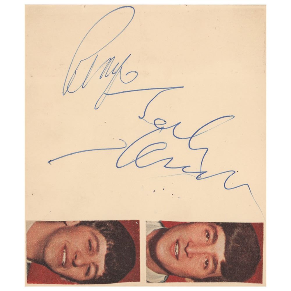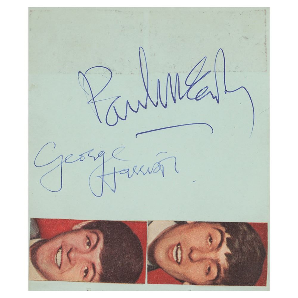 Vintage ballpoint signatures from the Beatles— “Paul McCartney” and “George Harrison,” on a light blue 4.5 x 3.75 album page; and “Ringo” and “John Lennon” on an off-white 4.5 x 3.75 album page. Both album pages bear colorful affixed images of the Beatles. The consignor notes that the autographs date to 1963-64. In fine condition, with a faint block of toning touching McCartney's signature. Accompanied by a certificate of authenticity from Tracks.