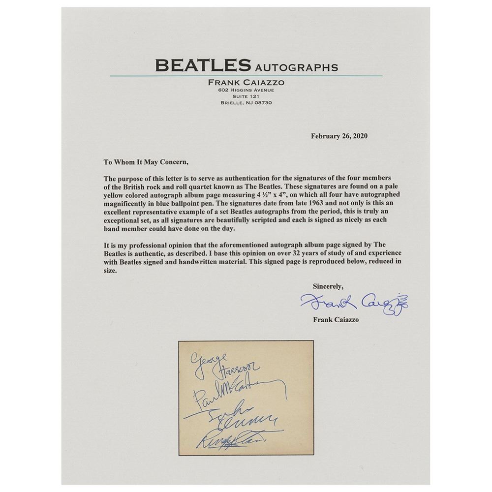 Pristine vintage circa late 1963 ballpoint signatures, "George Harrison," "Paul McCartney," "John Lennon," and "Ringo Starr,†on an off-white 4.5 x 4 album page, still contained within its original autograph book. Other signers in the book include The Temperance Seven, the Chris Barber Jazz Band, Billy J. Kramer, and a handful of other British musicians of the era. The Beatles page is in very fine condition; the autograph book itself has splits to the spine, with several pages loose. Accompanied by a letter of authenticity from noted Beatles expert Frank Caiazzo, in part: "The signatures date from late 1963 and not only is this an excellent representative example of a set of Beatles autographs from the period, this is truly an exceptional set, as all signatures are beautifully scripted and each is signed as nicely as each band member could have done on the day."