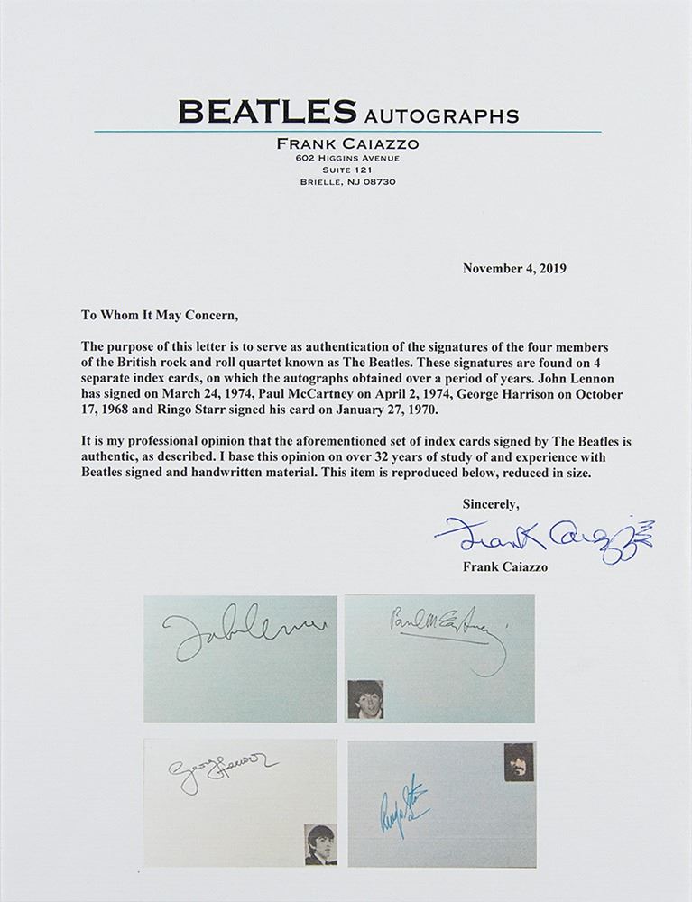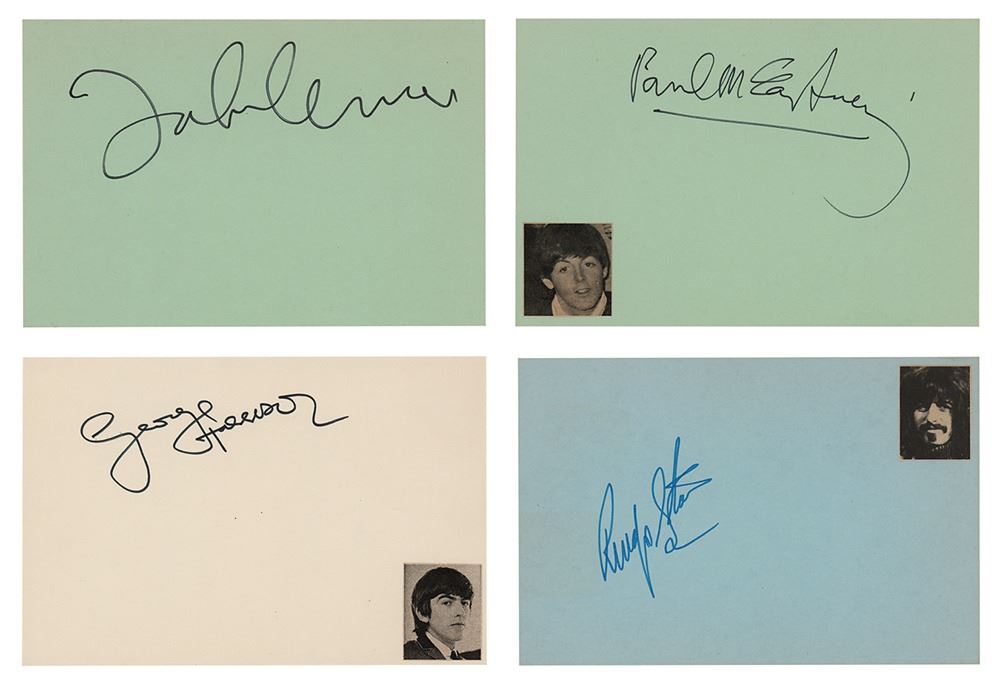 Beautiful felt tip signatures of the Beatles on four multi-colored 6 x 4 album pages bearing collector’s date notations on the backs: John Lennon (March 24, 1974), George Harrison (October 13, 1968), Paul McCartney (April 2, 1974), and Ringo Starr (January 27, 1970); the latter three album pages bear affixed images of the musicians. In overall very fine condition. Accompanied by a letter of authenticity from noted Beatles expert Frank Caiazzo.