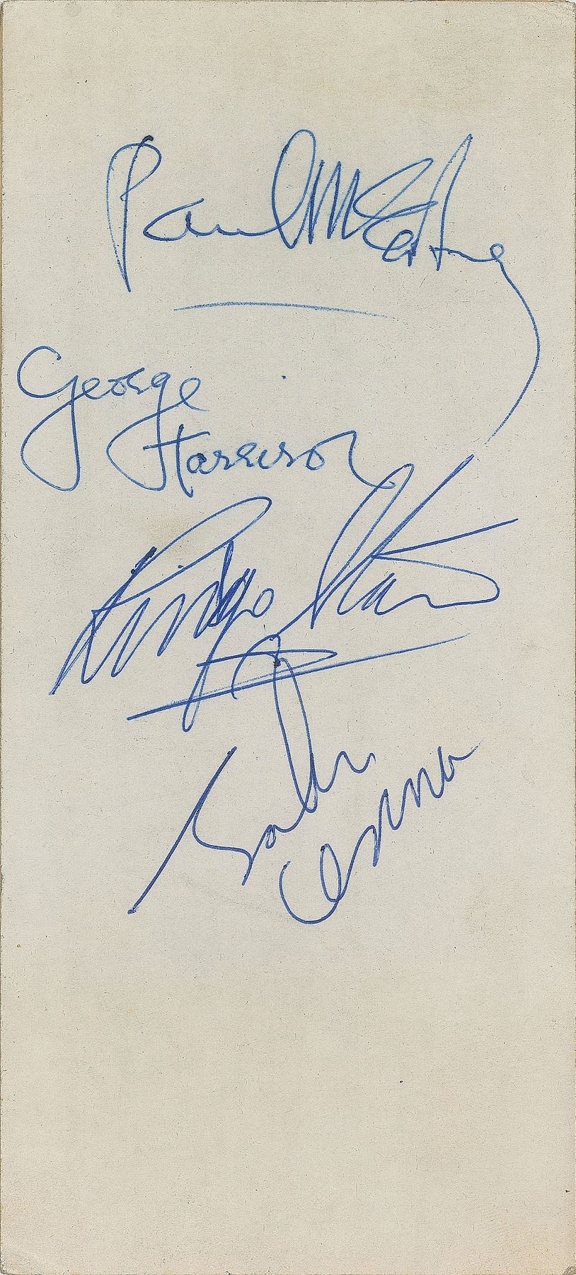 Bold ballpoint signatures of Paul McCartney, George Harrison, Ringo Starr, and John Lennon on the reverse of an off-white 3.5 x 7.75 studio header card from the Robert Lloyd Photographic Studio. In fine condition. Accompanied by a certificate of authenticity from Tracks. Consignor notes that the signatures were obtained backstage at the ABC Cinemas in Exeter on November 14, 1963. The Beatles began the UK leg of their 1963 Autumn tour on November 1st, and two weeks later made their way to ABC Cinemas, sharing the stage with The Brook Brothers, Peter Jay and the Jaywalkers, Vernons Girls, ad The Kestrels. The band's 10-song set included 'I Saw Her Standing There,' 'All My Loving,' 'You Really Got a Hold on Me,' and 'Twist and Shout.'