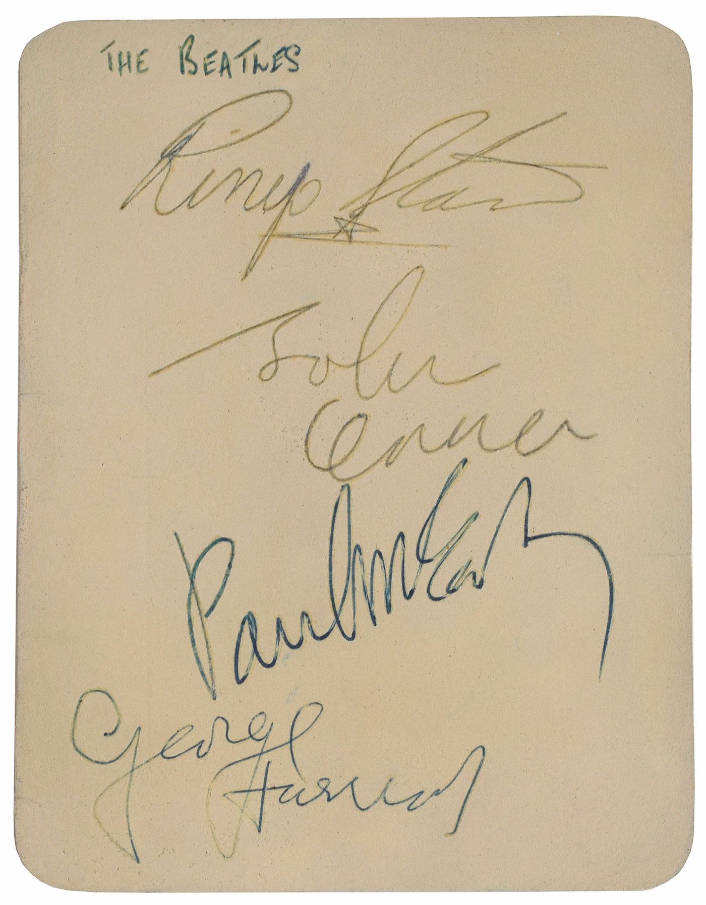 The band's selection as part of the Royal Variety Performance did much to propel Beatlemania across the whole of England. The group performed four songs—'From Me To You,' 'She Loves You,' 'Till There Was You,' and 'Twist and Shout'—and when ITV broadcasted the show a week later on November 10, an estimated 21 million people tuned in. This was also the event where John Lennon took a jab at the Crown with his famous bit of stage banter: ‘For our last number I'd like to ask your help. The people in the cheaper seats clap your hands. And the rest of you, if you'd just rattle your jewelry.’ A magnificent, fully signed piece from one of the earliest Beatles controversies.