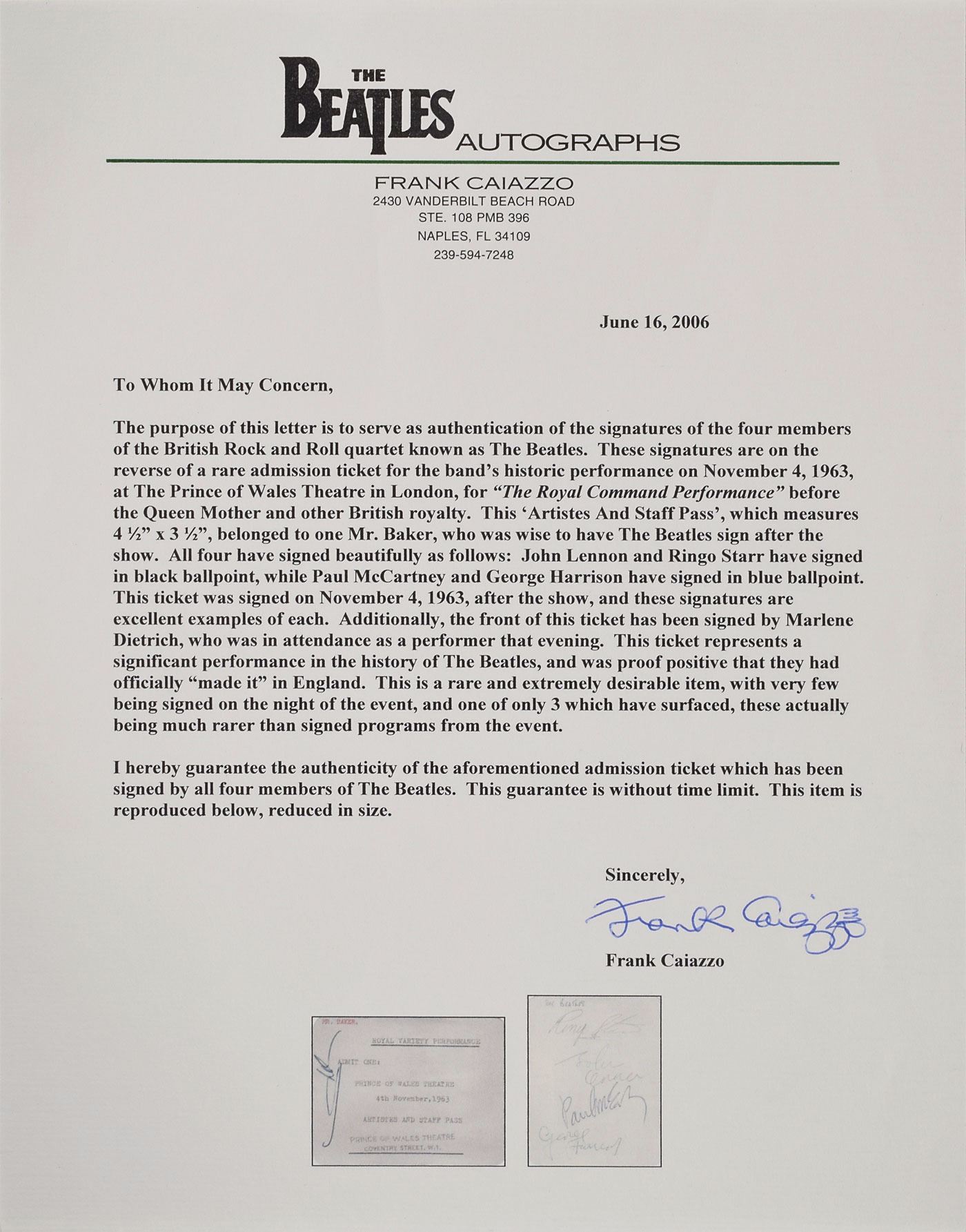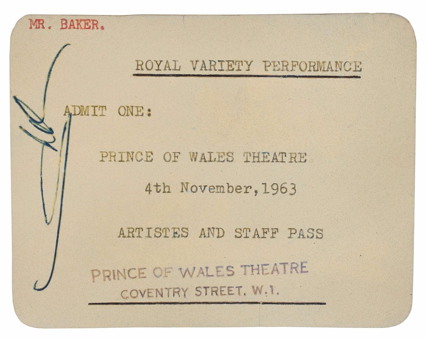 Immensely desirable ticket stub, 4.5 x 3.5, for the infamous appearance of the Beatles at the Prince of Wales Theatre in London on November 4, 1963, for a royal variety performance before Queen Elizabeth and the Queen Mother, issued as "Artistes and Staff Pass," with the ticket holder's name, "Mr. Baker," typed into the upper left corner. The reverse has been attractively signed in black ballpoint by Ringo Starr and John Lennon, and in blue ballpoint by Paul McCartney and George Harrison. Additionally, the front has been signed in black ink by legendary actress Marlene Dietrich, who was in attendance as a performer that evening. Restored to fine condition via tasteful and unobtrusive professional cleaning, which lightly impinges upon portions of the signatures. Accompanied by a letter of authenticity from noted Beatles expert Frank Caiazzo, in part: "The ticket was signed on November 4, 1963, after the show, and these signatures are excellent examples of each…This ticket represents a significant performance in the history of The Beatles, and was proof positive that they had officially 'made it' in England. This is a rare and extremely desirable item, with very few being signed on the night of the event, and one of only 3 which have surfaced, these actually being much rarer than signed programs from the event."