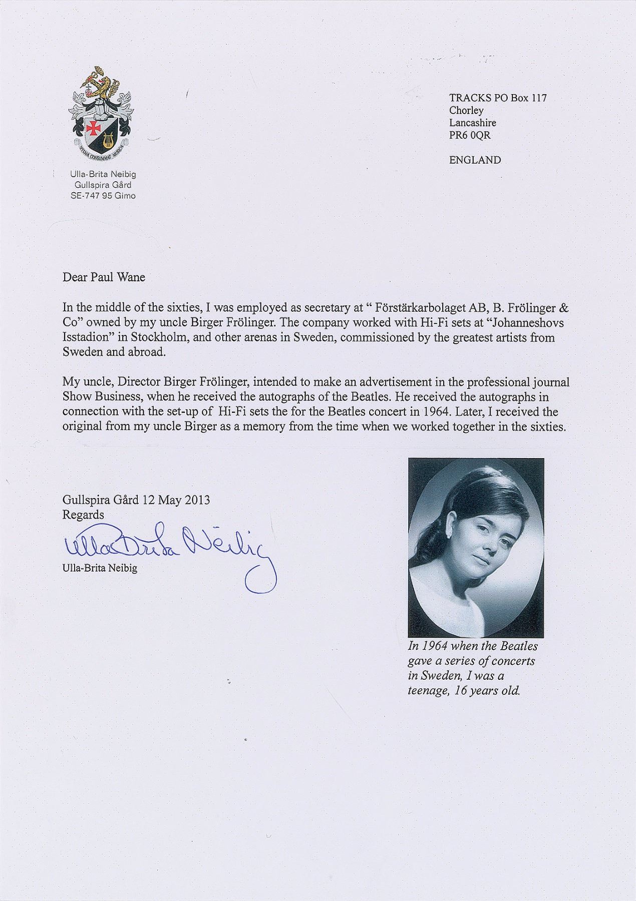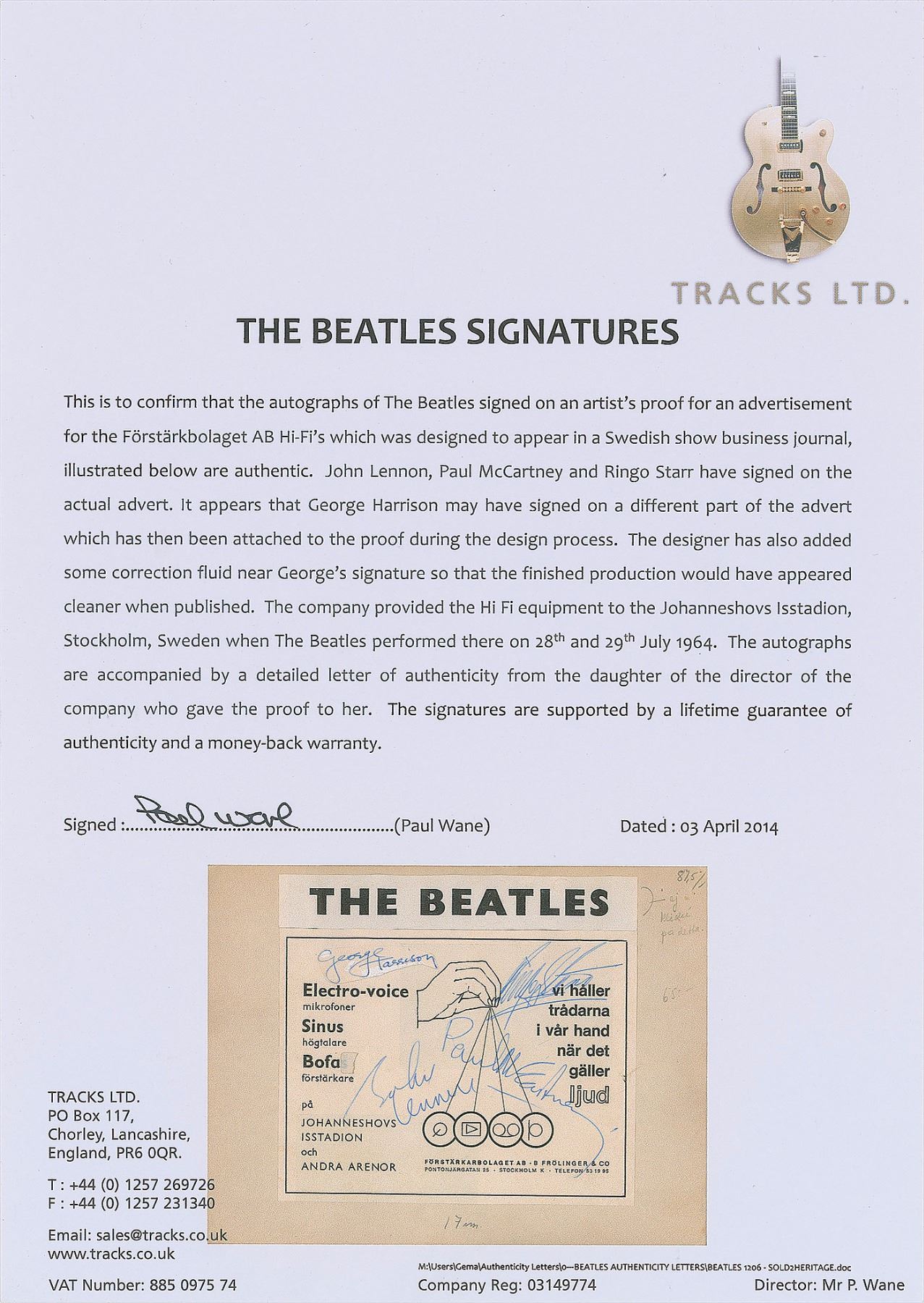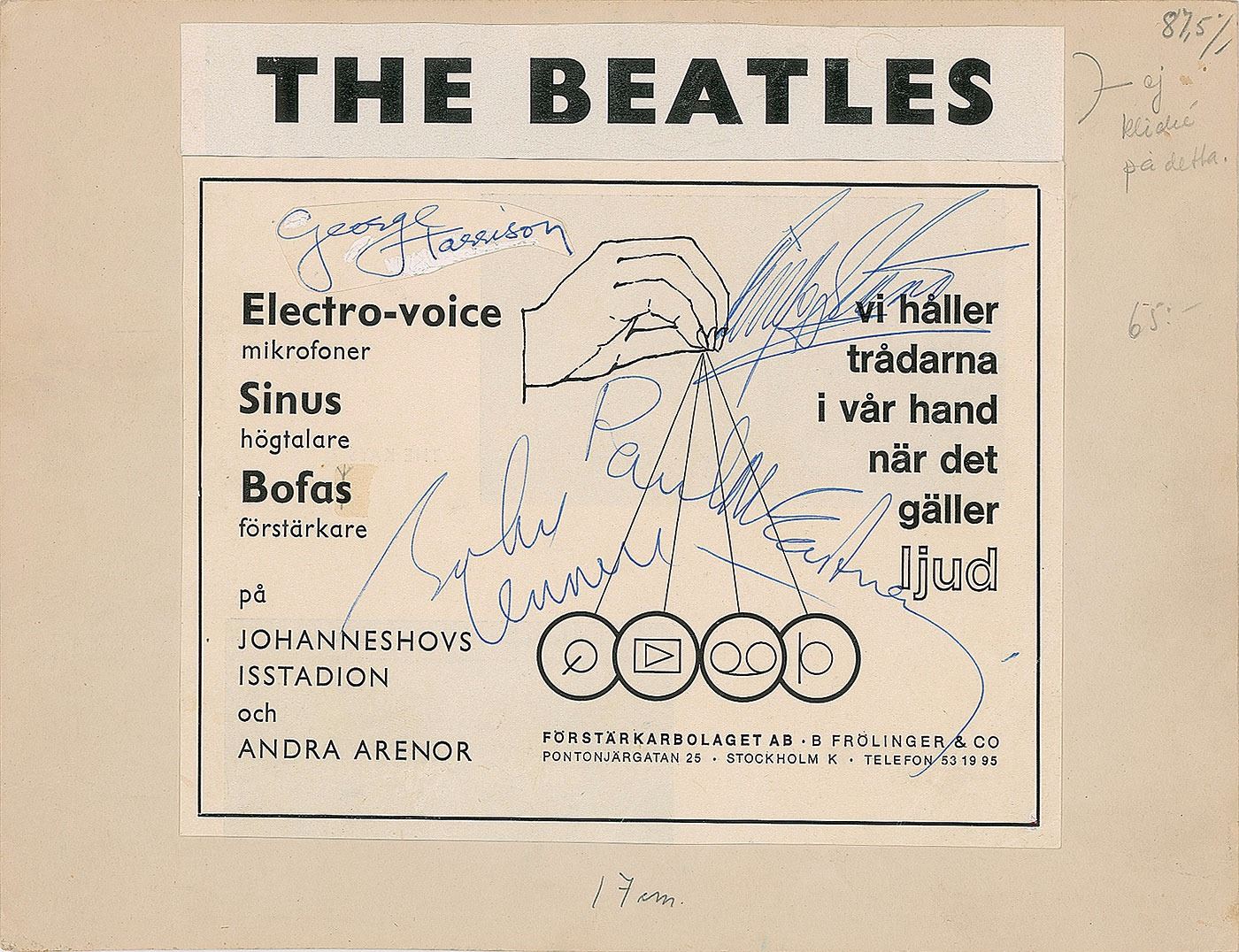 Vintage circa 1964 advertisement for the Swedish audio recording company Forstarkarbolaget AB, 8 x 6.25, affixed to a slightly larger cardstock sheet, signed on the advertisement in blue ballpoint by John Lennon, Paul McCartney, and Ringo Starr, with a closely clipped ballpoint signature of George Harrison affixed to the upper left. In fine condition, with some whiteout around Harrison's signature. Accompanied by a certificate of authenticity from Tracks, as well as a letter of provenance from the original recipient, in part: “In the middle of the sixties, I worked as secretary at ‘Forstarkarbolaget AB, B. Frolinger & Co.,’ owned by my uncle Birger Frolinger…My uncle…intended to make an advertisement in the professional journal Show Business, when he received the autographs of the Beatles. He received the autographs in connection with the set-up of Hi–Fi sets…for the Beatles concert in 1964.” Less than a year after their first visit to Sweden, the Beatles returned to Stockholm to play a series of four concerts at Johanneshovs Isstadion on July 28-29, 1964. The immensely popular two-day showcase was the penultimate stop on the band’s globe-trotting 1964 world tour, their first major international venture as a band.