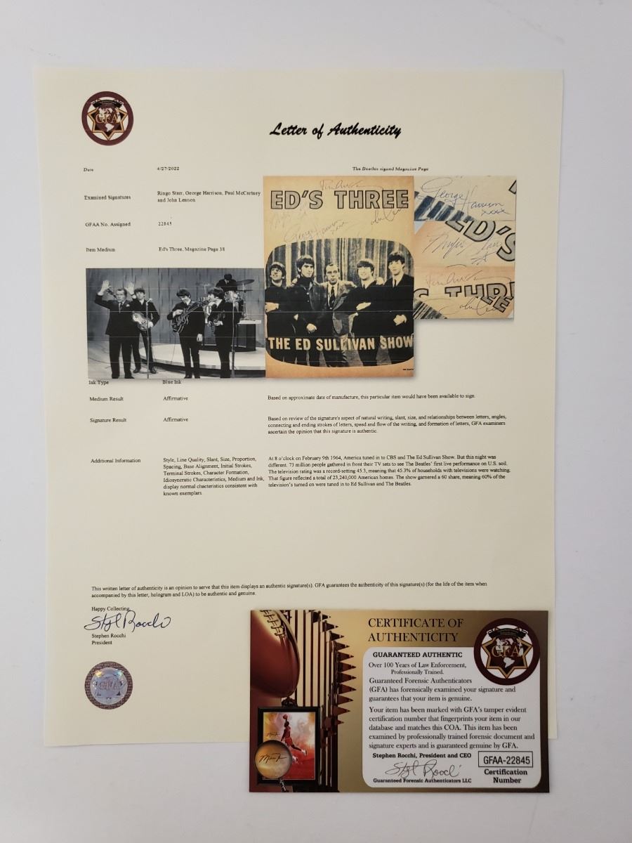 The Beatles (1960-1970) signed 8 X 10 Black and White Magazine Page. John Lennon, Paul McCartney, George Harrison and Ringo Starr signed in blue ink; all four signatures have faded over time. The Beatles were John Lennon, Paul McCartney, George Harrison, and Ringo Starr. One of the most successful and influential band in the history of popular music. The group were a main part of the creation of 1960s counterculture. They began as a skiffle and beat band and were influenced by 1950s American rock and roll. They later used parts of classical music and Indian music. Their main songwriters were Lennon and McCartney. Before The Beatles became popular, they played in clubs in Liverpool and Hamburg over three years between 1960 and 1963, with Stuart Sutcliffe playing bass. They went through many drummers, including Pete Best, before finally asking Ringo Starr to join in 1962. Sutcliffe also quit, meaning Paul McCartney started playing the bass instead. Brian Epstein was their manager and George Martin produced most of their music. Their first single was "Love Me Do", in late 1962. It was a hit and they became popular in the United Kingdom. As they became more popular, the press called the popularity "Beatlemania". By 1964, the Beatles were worldwide stars and led the "British Invasion" of the United States. They brought out some of the best-selling albums of the 1960s, with twelve studio albums. They broke-up in 1970. John Lennon was later murdered in New York City in 1980 and George Harrison died of lung cancer in 2001. McCartney and Starr still make music. Comes with a Letter of Authentication from Guaranteed Forensic Authenticators (GFA), along with the GFA guarantee of authenticity.