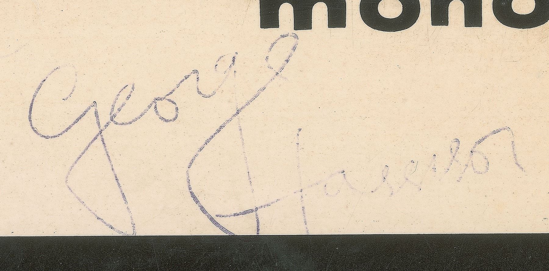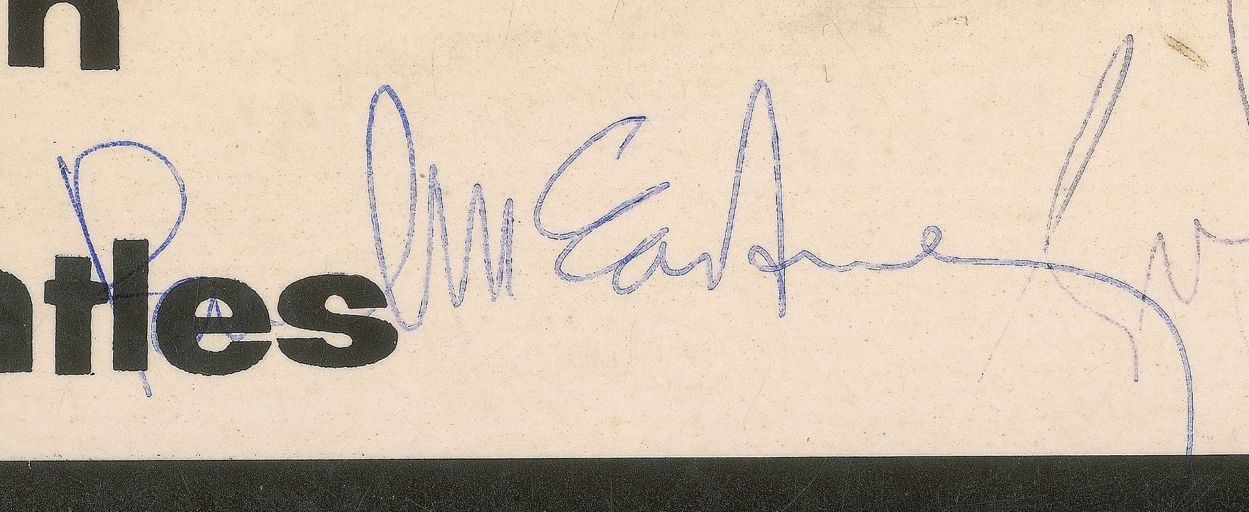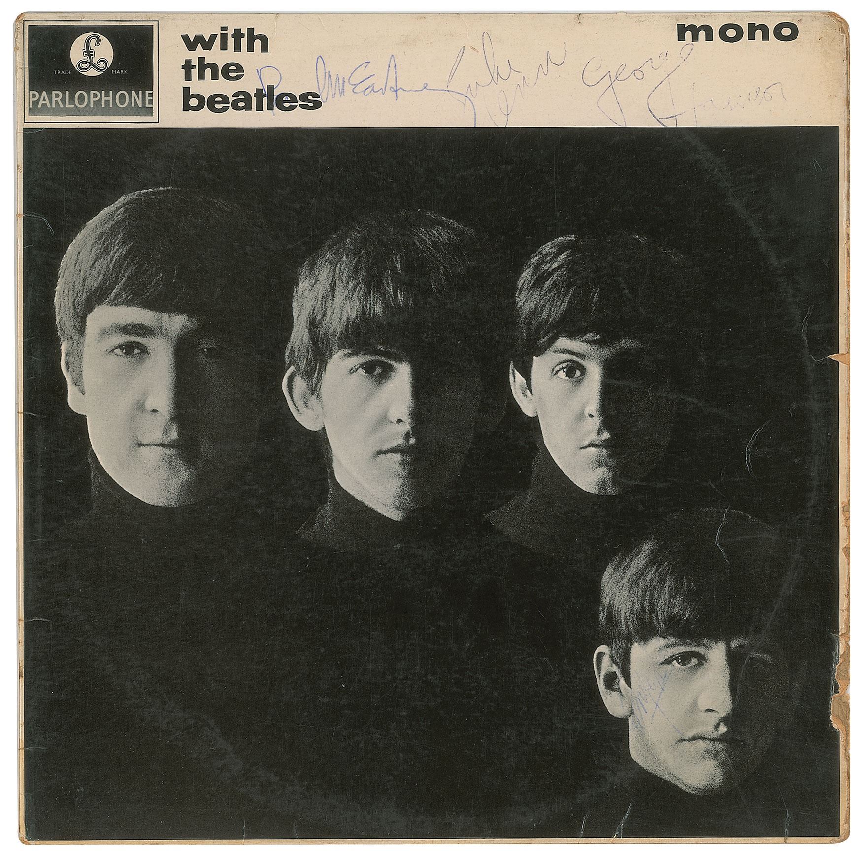 Very desirable 1963 Parlophone mono pressing of the With the Beatles album, signed on the front cover in ballpoint by Paul McCartney, John Lennon, George Harrison, and Ringo Starr, who signs over his image, with the other members signing in the upper border. In very good condition, with some light wrinkling to the emulsion, and a short tear and some damage along the right edge; Harrison's last name is light but fully legible, Ringo's first name is very light, and his last name is predominately indentations with only minor ink adhesion. The record is included.