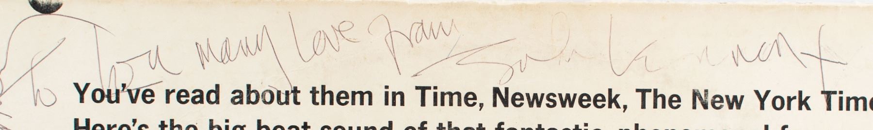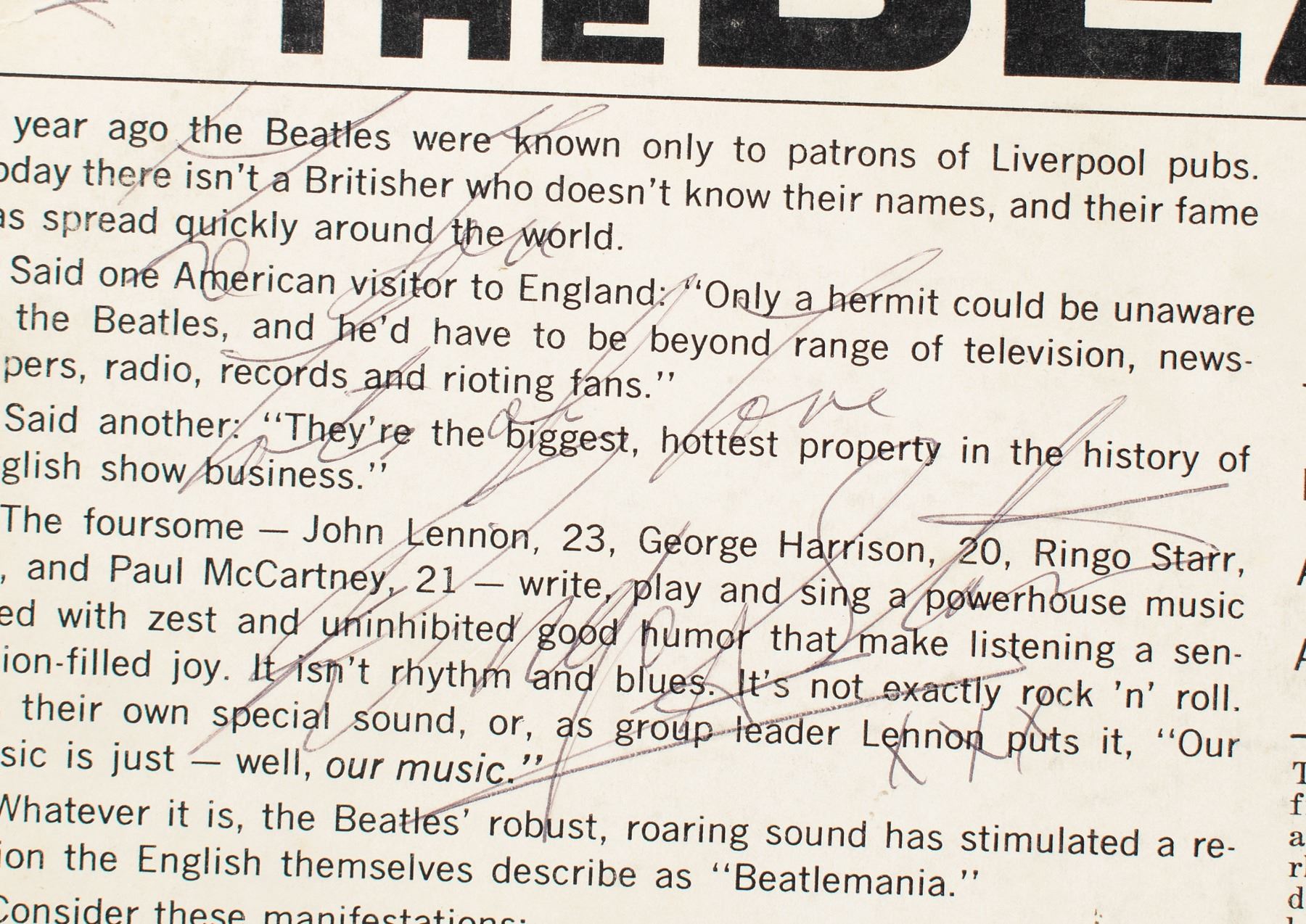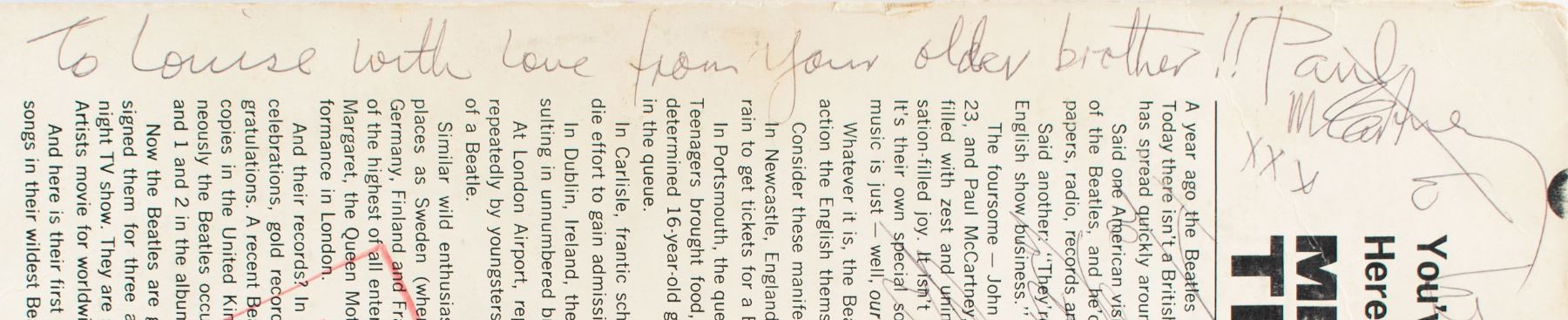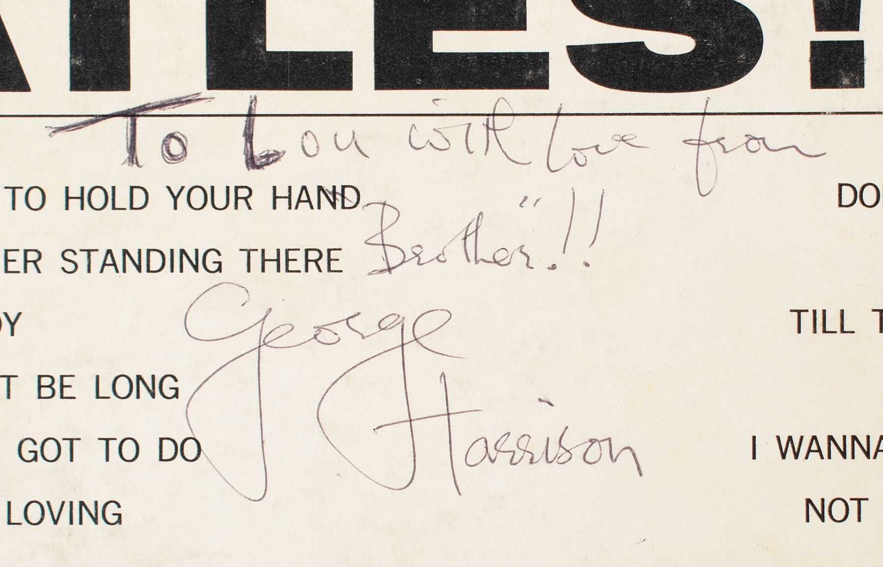 Meet the Beatles! promotional album signed and inscribed on the back cover in black ballpoint to George Harrison's older sister Louise: "To Lou with love from Brother!! George Harrison," "To Lou many love from John Lennon, x," "To Louise with love from your older brother!! Paul McCartney, xxx," and "To Lou, Lots of love, Ringo Starr, xxx." In very good to fine condition, with light soiling, partial edge separations, and a small area of surface loss to the front. The record is not included. Beatles albums inscribed to one of their family members are virtually nonexistent and hugely desirable.