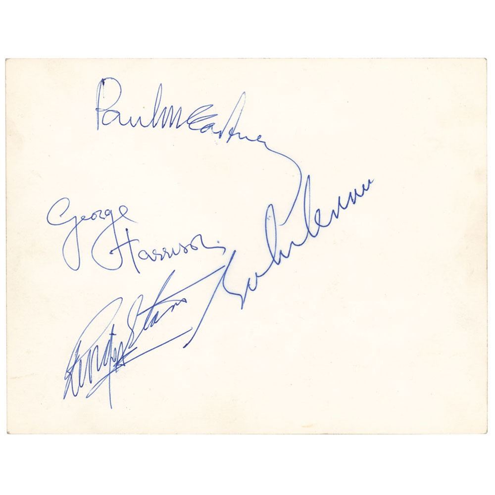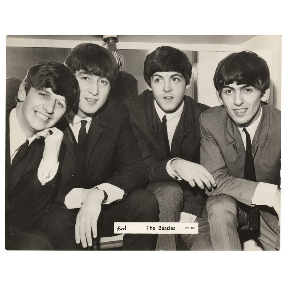 Accompanied by a certificate of authenticity from Tracks, and by a letter of provenance from the cousin of the original recipient, which reads: “During the early 1960s my cousin worked for the British Broadcasting Corporation in London. Whilst she worked there as a secretary in around 1963, the Beatles were there for an appearance and she asked them for their autographs which they signed on the back of two promotional photos. I was given one which I have kept since that day and the other was given to my sister.†In 1963, Brel merchandising photographs was launched by Brian Elwood in North London. Elwood (nicknamed Brel) endeavored to offer high-end photographic prints as an alternative to the lower quality fan cards of the day. The image on this card was captured in late 1963 by well-known music photographer, Bill Francis, who photographed the Beatles many times and was credited for the 1965 ‘Beatles VI’ album cover shoot. To date, this is the finest example of a Beatles-signed Brel photo that we have encountered.