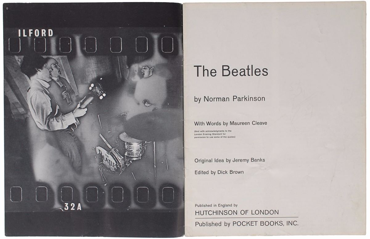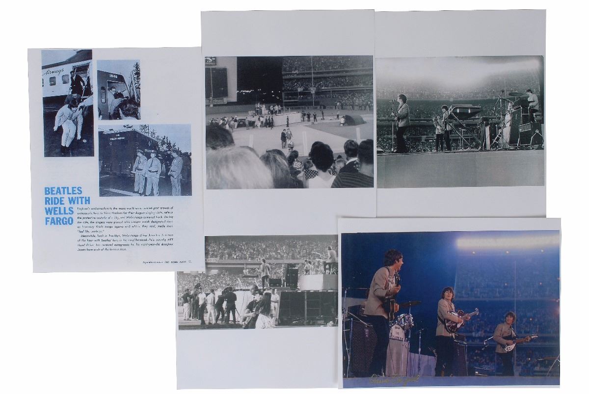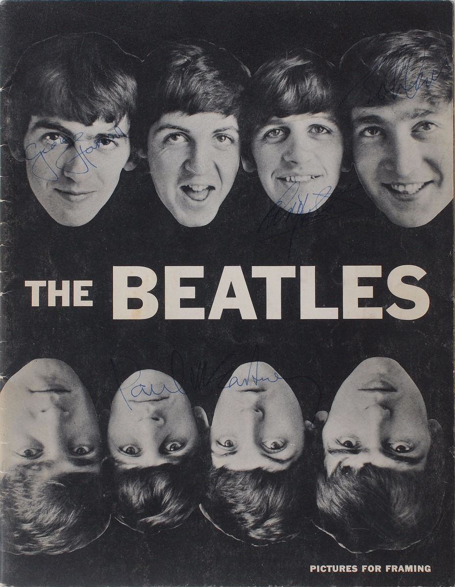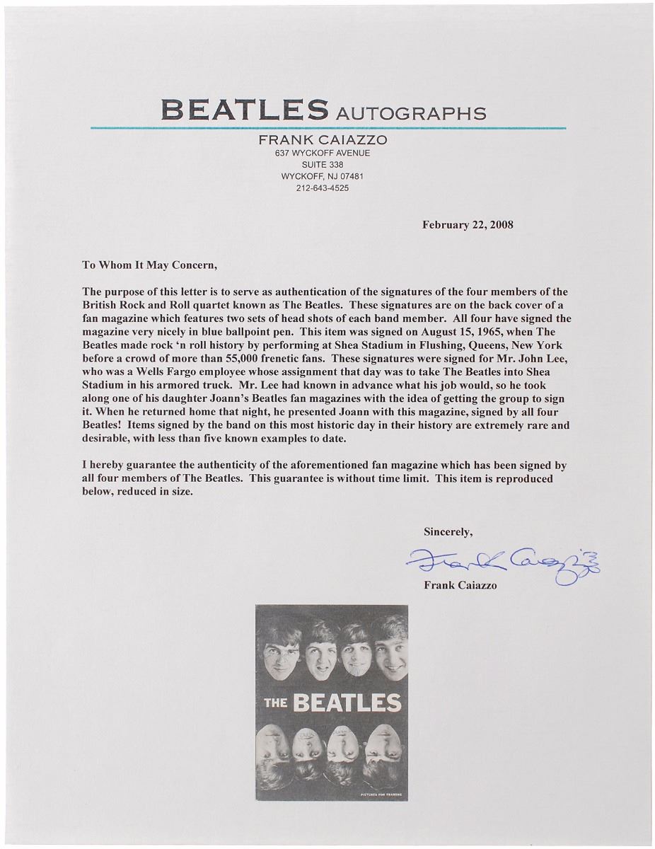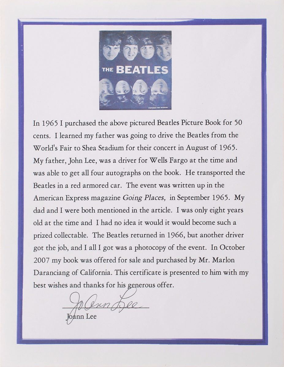 Exceptional program-style Beatles fan photo book featuring ‘pictures for framing’ published by Pocket Books, Inc., 8.5 x 11, signed on the back cover in blue ballpoint by John Lennon, Paul McCartney, George Harrison, and Ringo Starr on the day of their famous Shea Stadium concert in 1965. In fine condition. Accompanied by a letter of authenticity from noted Beatles expert Frank Caiazzo, in part: “This item was signed on August 15, 1965…for Mr. John Lee, who was a Wells Fargo employee whose assignment that day was to take The Beatles into Shea Stadium in his armored truck….He took along one of his daughter Joann’s Beatles fan magazines with the idea of getting the group to sign it….Items signed by the band on this most historic day in their history are extremely rare and desirable, with less than five known examples to date [as of February 2008].” Also includes a letter of provenance from the driver’s daughter Joann, as well as copies of an article in a 1965 issue of the American Express magazine 'Going Places’ about John Lee driving the Beatles, and copies of images of Lee’s badge and truck. The Shea Stadium concert was the largest Beatles show up to that point with an attendance of over 55,000 and it was the subject of a noted documentary that captured the widespread hysteria of American Beatlemania. Extremely rare, with excellent provenance, and signed on a date of utmost importance, this is an absolutely remarkable piece.