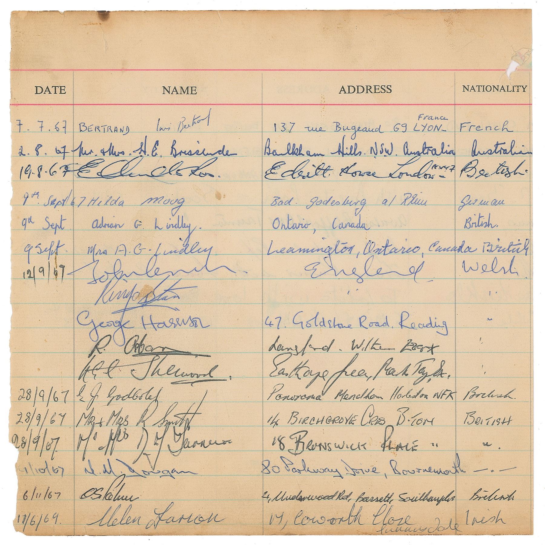 Rare vintage 8 x 8 guest book page from an unknown venue that has been signed in blue ballpoint, “John Lennon,” “George Harrison,” and “Ringo Starr.” Lennon lists his address as “England” and his nationality as “Welsh,” and Harrison writes down a fake address, “47. Goldstone Road Reading.” The signatures date to September 1967, when the Beatles were shooting scenes for Magical Mystery Tour. In very good to fine condition, with a short tear to the upper right corner, a small stain touching Ringo's signature, and old mounting residue on the back. Accompanied by a certificate of authenticity from Tracks.