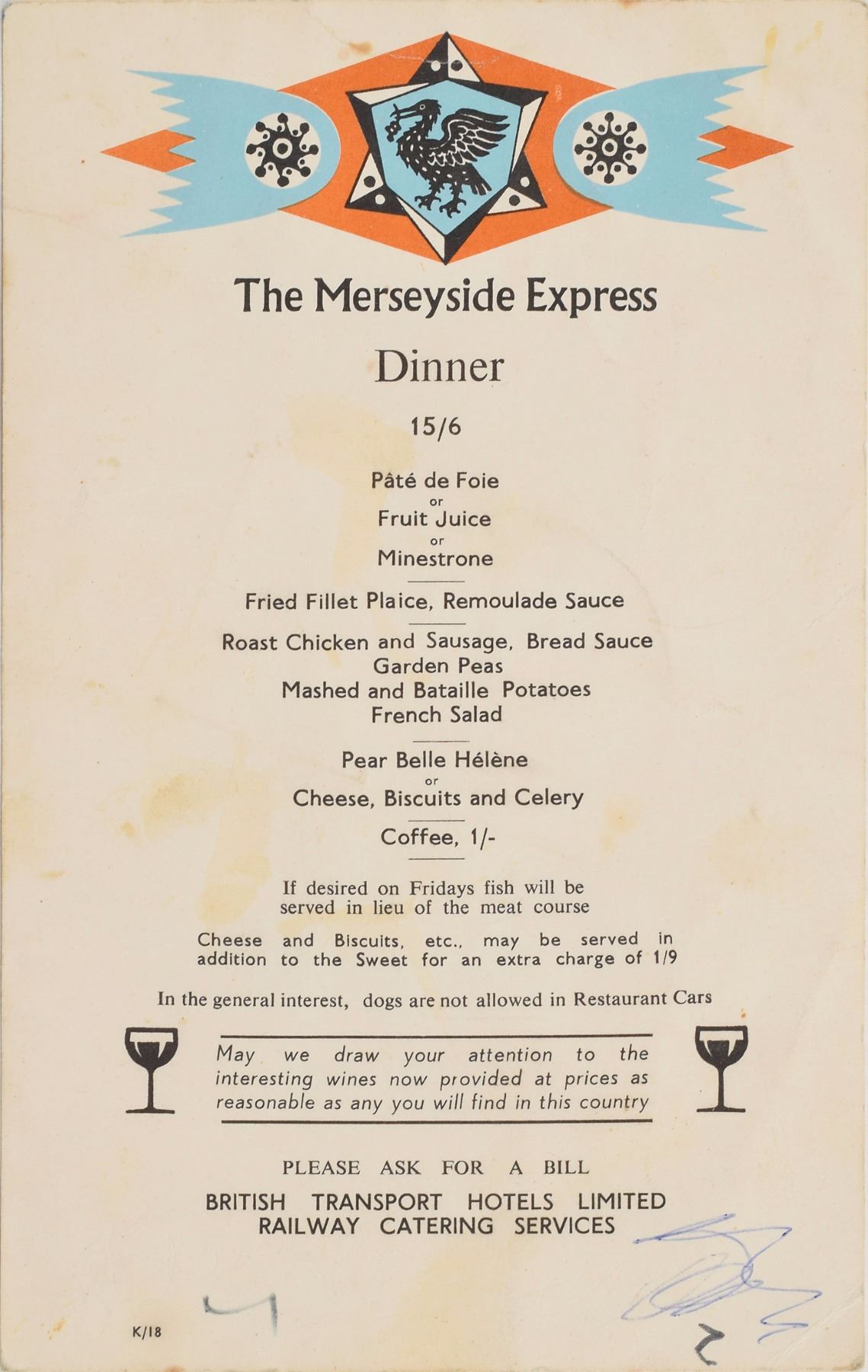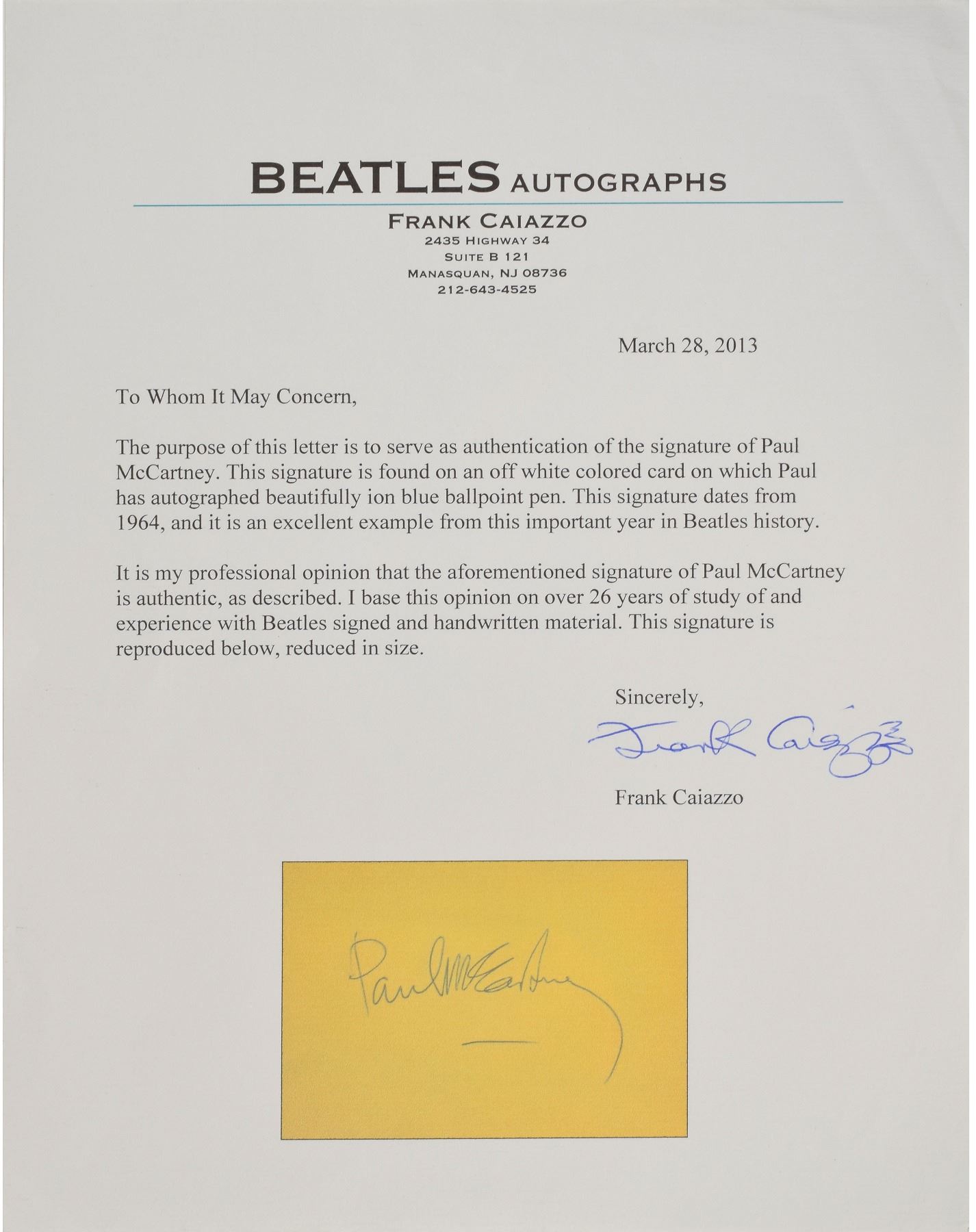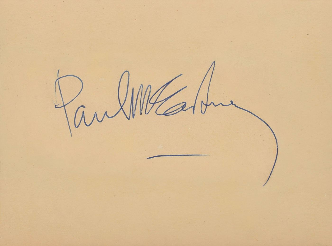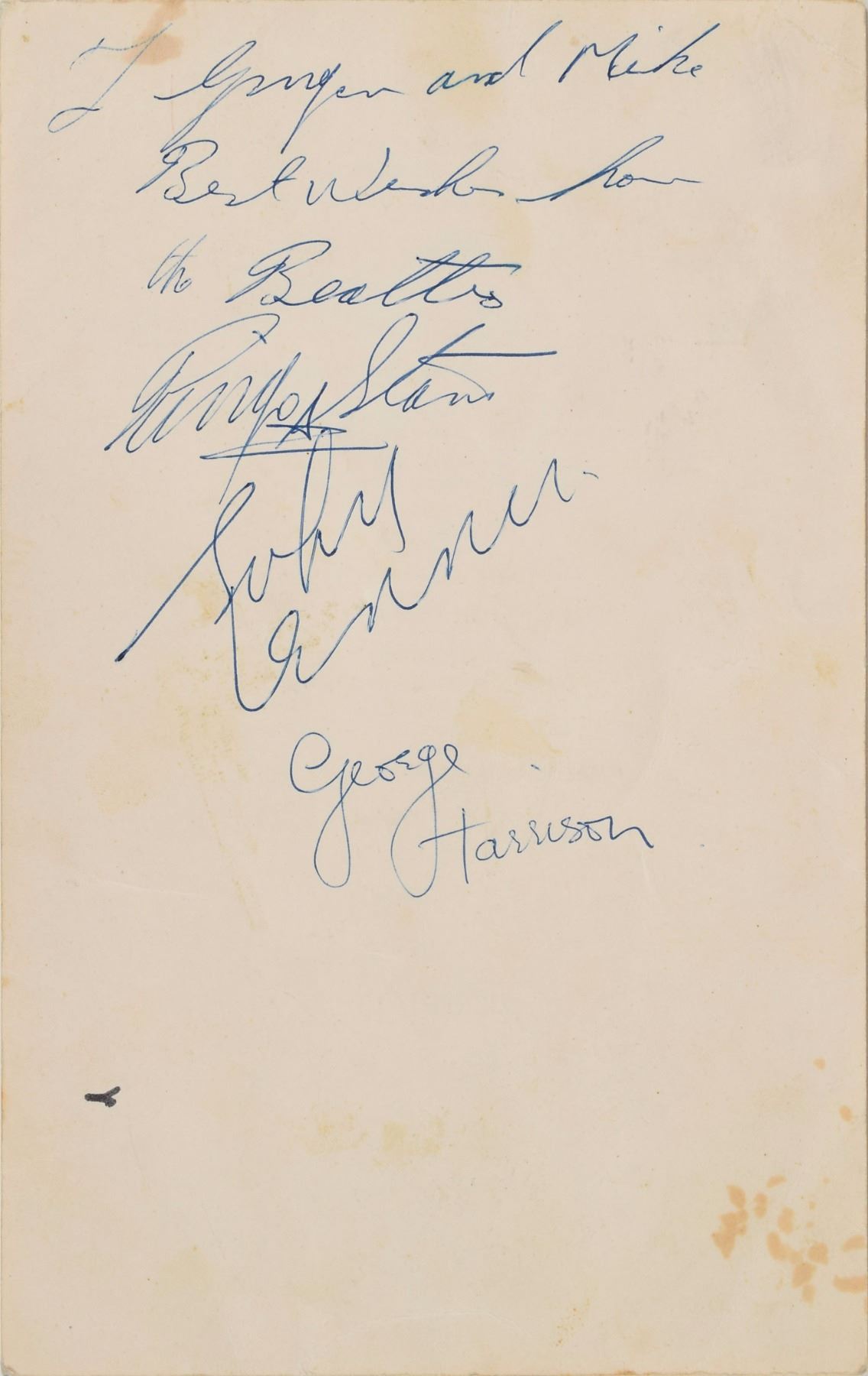 Vintage dinner menu from The Merseyside Express passenger train, June 15 (no year), 5 x 8, signed and inscribed on the reverse in ballpoint, “To Ginger and Mike, Best wishes from, the Beatles, Ringo Starr,” “John Lennon,” and “George Harrison.” Also included is a vintage circa 1964 ballpoint signature, “Paul McCartney,” on a beige 4.75 x 3.5 sheet. In overall fine condition, with some light staining, creasing, and handling wear; McCartney's signature is in fine condition. Accompanied by a letter of authenticity from noted Beatles expert Frank Caiazzo for the McCartney signature, indicating that the signature dates to 1964 and “is an excellent example from this important year in Beatles history.”