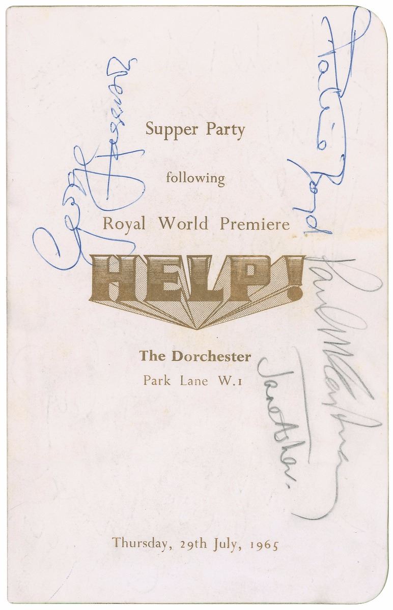 Original 4.5 x 7 menu for the supper party following the Royal World Premiere of Help!, held at the Dorchester Hotel on July 29, 1965. Signed on the front cover in blue ballpoint, “George Harrison” and “Pattie Boyd,” and in pencil “Paul McCartney” and “Jane Asher”; signed and inscribed in black ballpoint on the inside front cover, “To Dottie, what happened to Bernard on his birthday? Love, John Lennon xx,” and “For Aunt Dot I luv yer, Victor Spinetti,” adding a self-caricature next to his signature; signed on the adjacent opening page in pencil, “Ringo Starr,” and in blue ballpoint, “Thank you Bernard for a lovely evening, Cynthia,” “Love, Patrick Kerr,” “Patrick Cargill,” and “There you go! Roy Kinnear!”; and signed on the following page, “Neil Aspinall, Stanley that me,” with an arrow pointing to the word lemon on the menu, and additionally signed and inscribed by one other on the reverse of the first page. In fine condition.