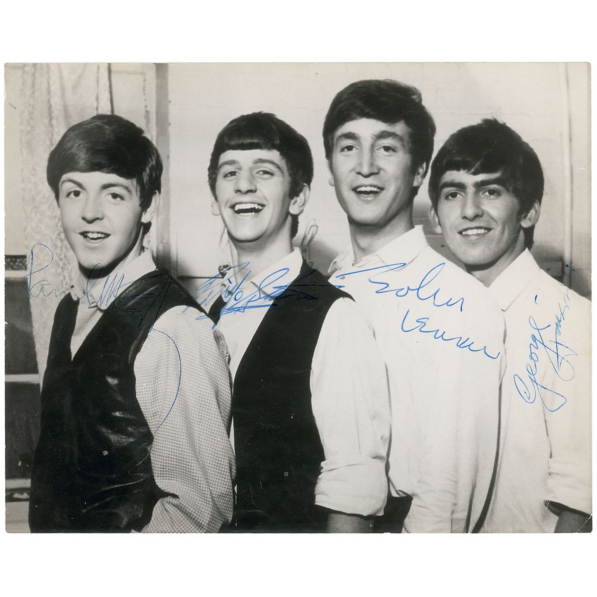 Exceptional vintage glossy 10 x 8 photo of the band posing together in a row, signed in fountain pen, “John Lennon,” “George Harrison,” and “Ringo Starr,” and in blue ballpoint, “Paul McCartney.” Reverse of photo bears a “Studio ‘4’ and Topical Press Agency,” London stamp. In very good condition, with overall scattered creasing and surface impressions (two heavier diagonal creases to lower right corner, one of which passes through Harrison’s signature) and single pinhole to top edge. Accompanied by full letters of authenticity from Roger Epperson/REAL and PSA/DNA. Research indicates that this photo was taken backstage at the Odeon Cinema Southend, May 31, 1963, where they were performing for day 13 of their UK tour with Roy Orbison. A larger-than-usually seen, boldly signed, and visually impressive image of the Fab Four.