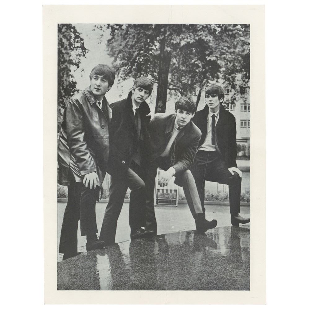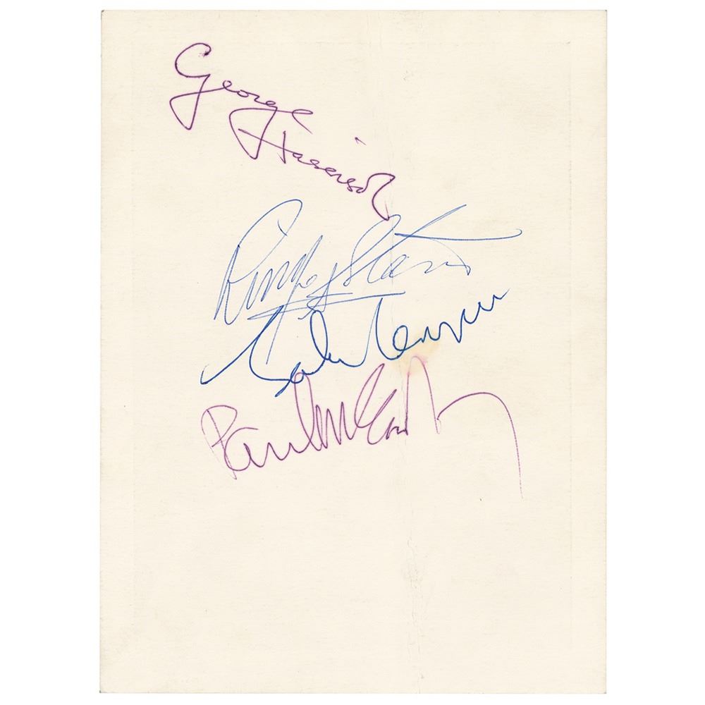 Sought-after vintage 1963 glossy 6 x 8 promotional photo of the Beatles posing outdoors near a public fountain, signed on the reverse in red ink by George Harrison and Paul McCartney, and in blue ballpoint by Ringo Starr and John Lennon. The consignor notes that the signatures were obtained at the ABC Cinema in Hull, England on November 24, 1963. In very good to fine condition, with a central vertical fold, and a stain touching Lennon and McCartney's last names. Accompanied by a certificate of authenticity from Tracks and by a letter of provenance from the original recipient: “I can confirm that I got The Beatles signatures at Hull’s ABC Cinema on November 24th 1963. I was an international rugby league player and played for Hull Kingston Rovers. I was asked to work as a steward on the night. I was backstage in the interval when I got the signatures.” These photographs were used as inserts in the Beatles’ 1963 Autumn tour program.