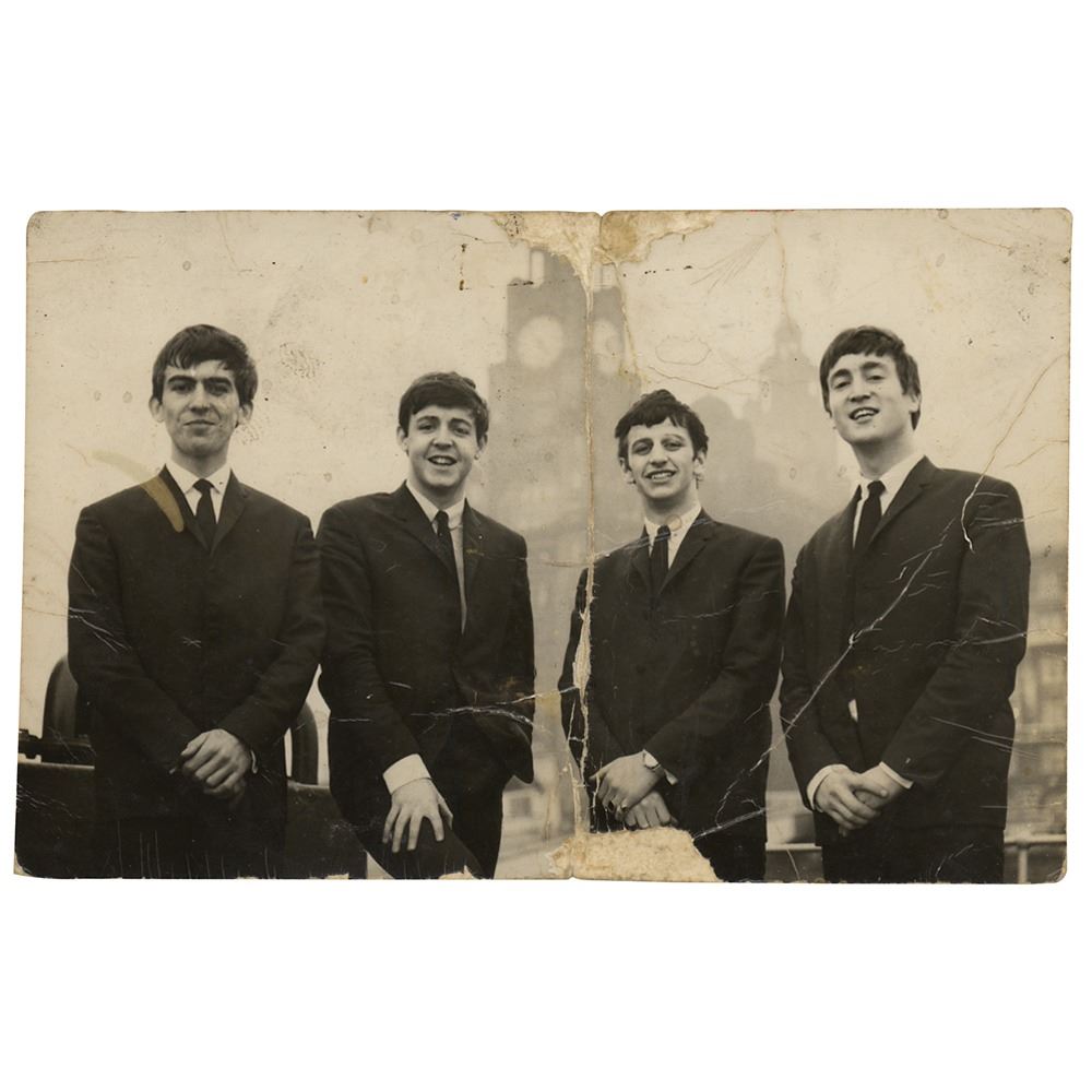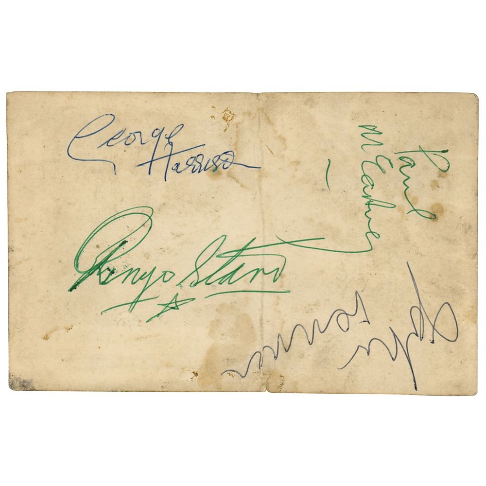 Vintage glossy 5.25 x 3.5 photo of the Beatles, signed on the reverse in green ballpoint by Paul McCartney and Ringo Starr, in black ballpoint by John Lennon, and in blue ballpoint by George Harrison. The photograph was taken by Les Chadwick during a photo session with the Beatles in late September 1962, just one month after Ringo had joined the group. Chadwick was employed by the Liverpool-based Peter Kaye Photography Studios, a company that photographed the Beatles on many occasions. An extremely limited quantity of these photographs was signed by the Beatles for people that joined their fan club. The consignor notes that the signatures date to late 1962/early 1963. In very good condition, with surface loss to the photo side, staining, creasing, and a heavy central vertical fold. Accompanied by a certificate of authenticity from Tracks, and by a letter of provenance from the original recipient: “I have had these since about 1962. They were popular in Liverpool and someone started a small fan club which I joined. This was the photo I received.
