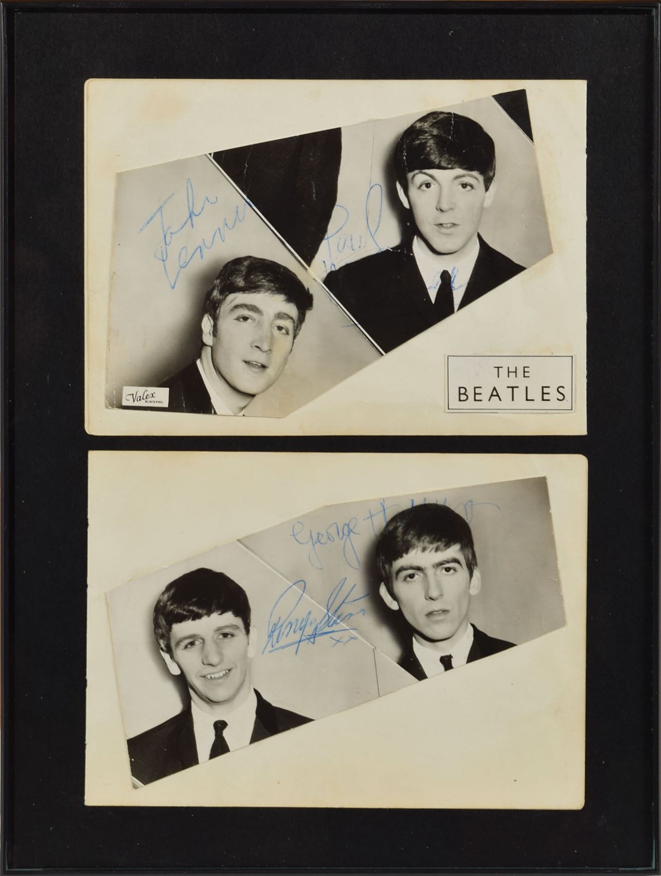 Appealing pair of vintage photos of the Beatles, trimmed from a glossy Valex of Blackpool promotional photo to sizes of 6.25 x 4.75 and 6.25 x 4, each photo signed in blue ballpoint by the pictured Beatles duo, "John Lennon," "Paul McCartney," "George Harrison," and "Ringo Starr, xx." The photos are affixed to individual off-white 7 x 5 sheets. Framed and in very good condition, with moderate overall creasing and fair contrast to McCartney's surname against his dark suit.
