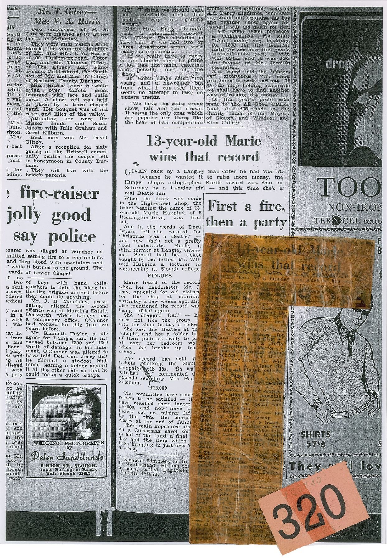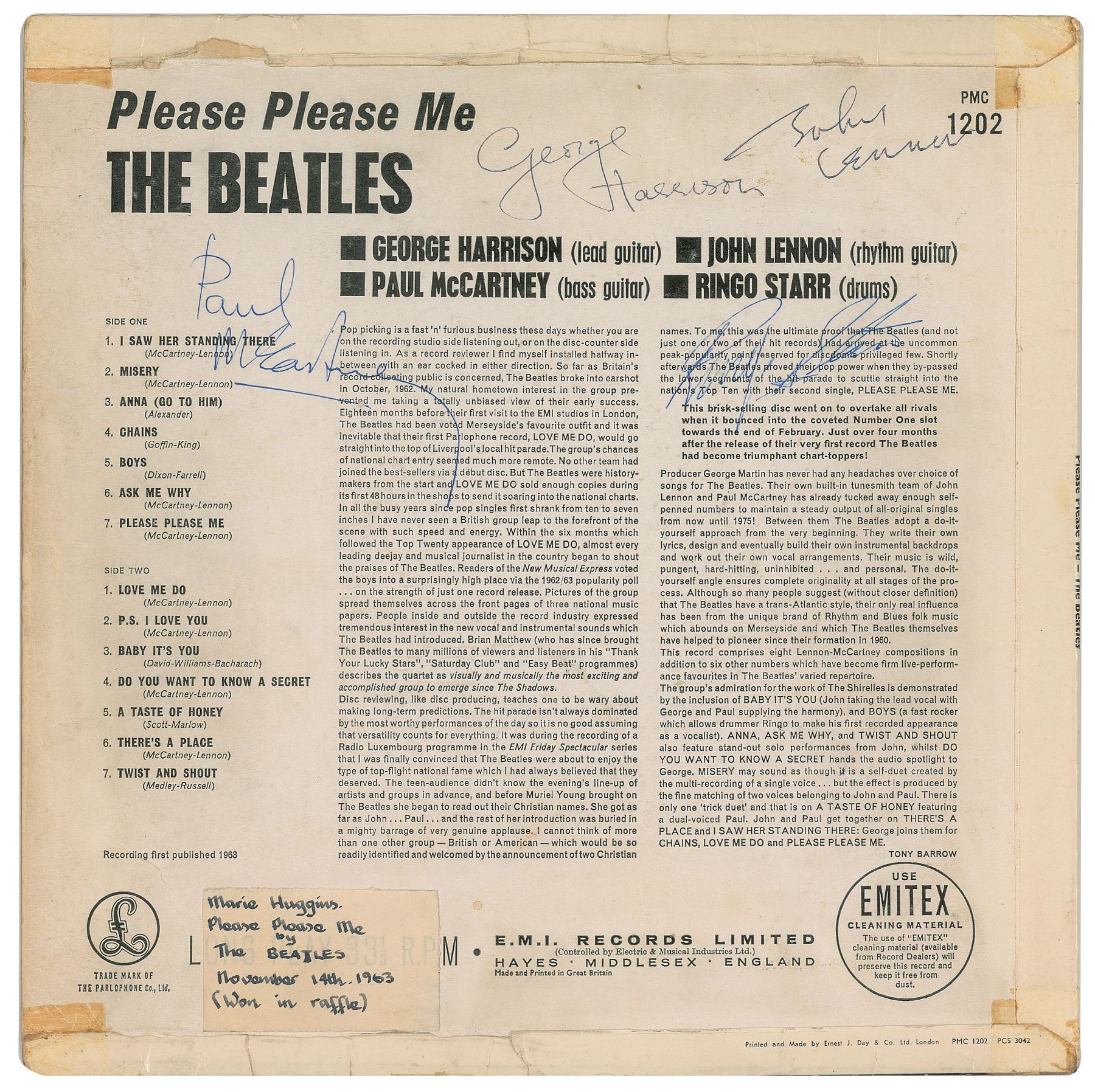 Please Please Me album (black-and-yellow UK mono Parlophone pressing), neatly signed on the reverse in ballpoint, "John Lennon," "Paul McCartney," "George Harrison," and "Ringo Starr." The autographs were signed in Slough on November 5, 1963, and donated as a raffle prize for a local charity. The raffle was drawn on November 14, 1963, which was won by a girl from Langley named Marie Huggins; a handwritten raffle label is affixed to the lower left corner. In very good to fine condition, with a few small tape stains, and partial separation along a seam. The record is included. Accompanied by the original raffle ticket stub (number "320"), a contemporary newspaper article covered in toned tape, and a legible photocopy of the same article. Also includes a certificate of authenticity from Tracks.