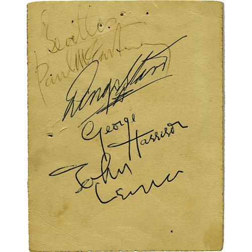 <B>Beatles Signed Promo Card.</B></I> This 4.5" x 3.5" promo card for an April 20, 1963 dance at the Mersey View Ballroom is signed on the back by Paul McCartney in black ink and by Ringo Starr, George Harrison, and John Lennon in blue ink. Signed near the end- their pre-celebrity period, this is an excellent piece to have, since items autographed by the band after 1963 are difficult enough to find, and, after 1969, extremely scarce. After the band stopped doing live concerts in 1966, they came together as a group mostly just for recording sessions, and that only until production concluded on "Abbey Road" in August, 1969. In Very Fine condition, the card has mild overall tanning that is more pronounced around the edges, some very light edge wear and blunted corners, and a few tack holes that do not affect the signatures. <I>With COA from PSA/DNA.</B></I>