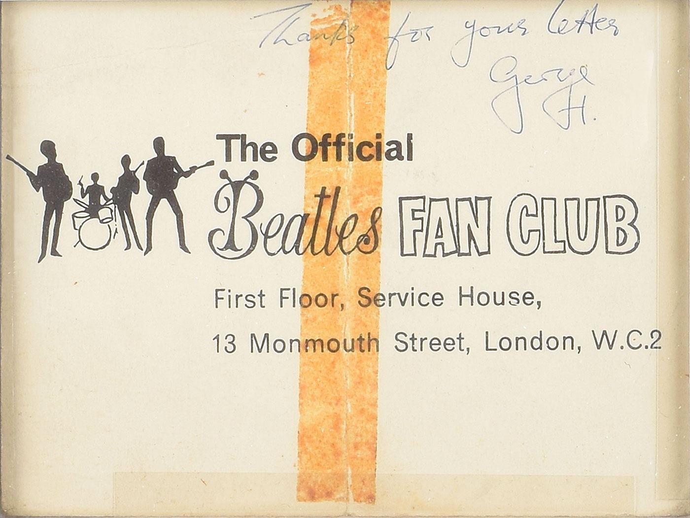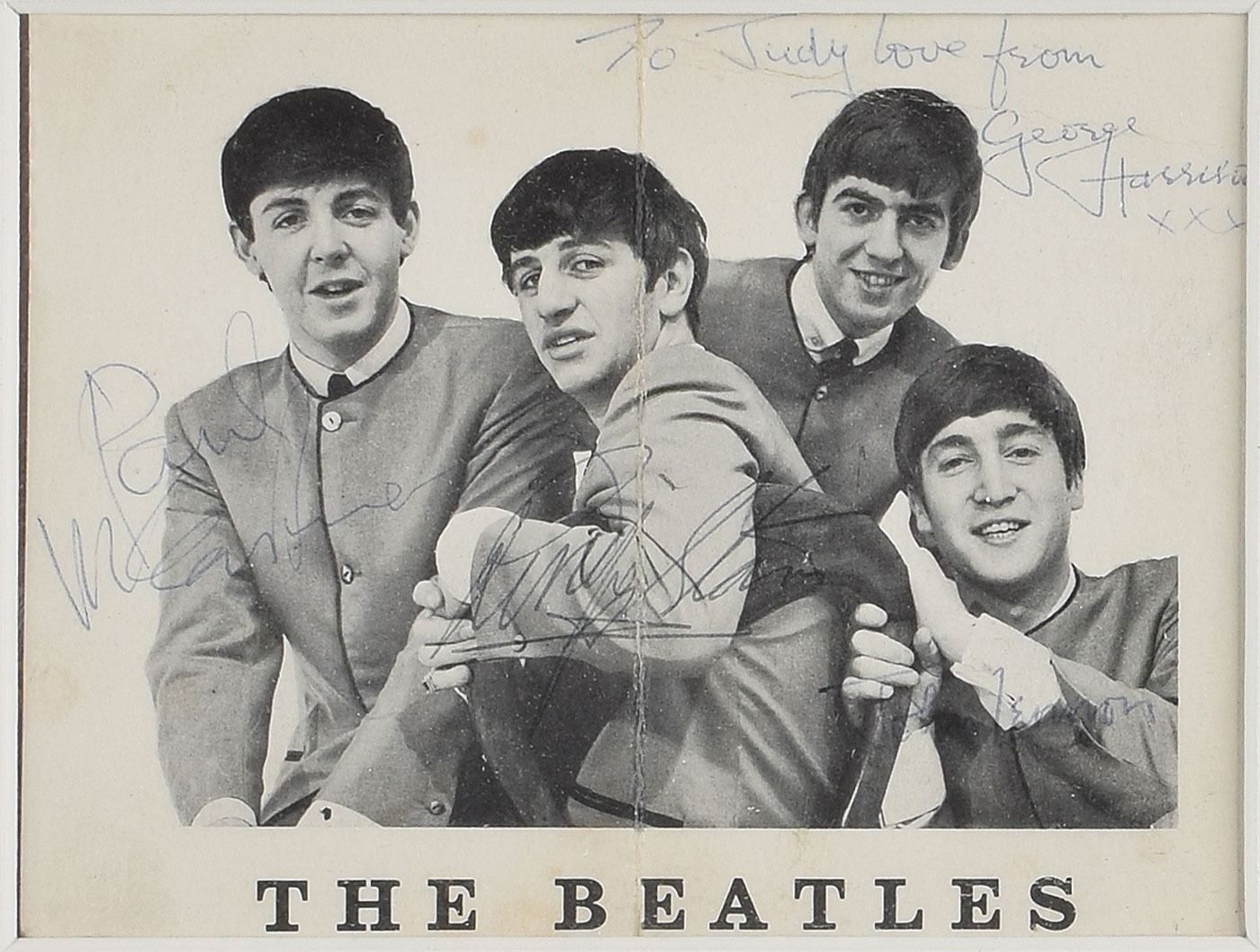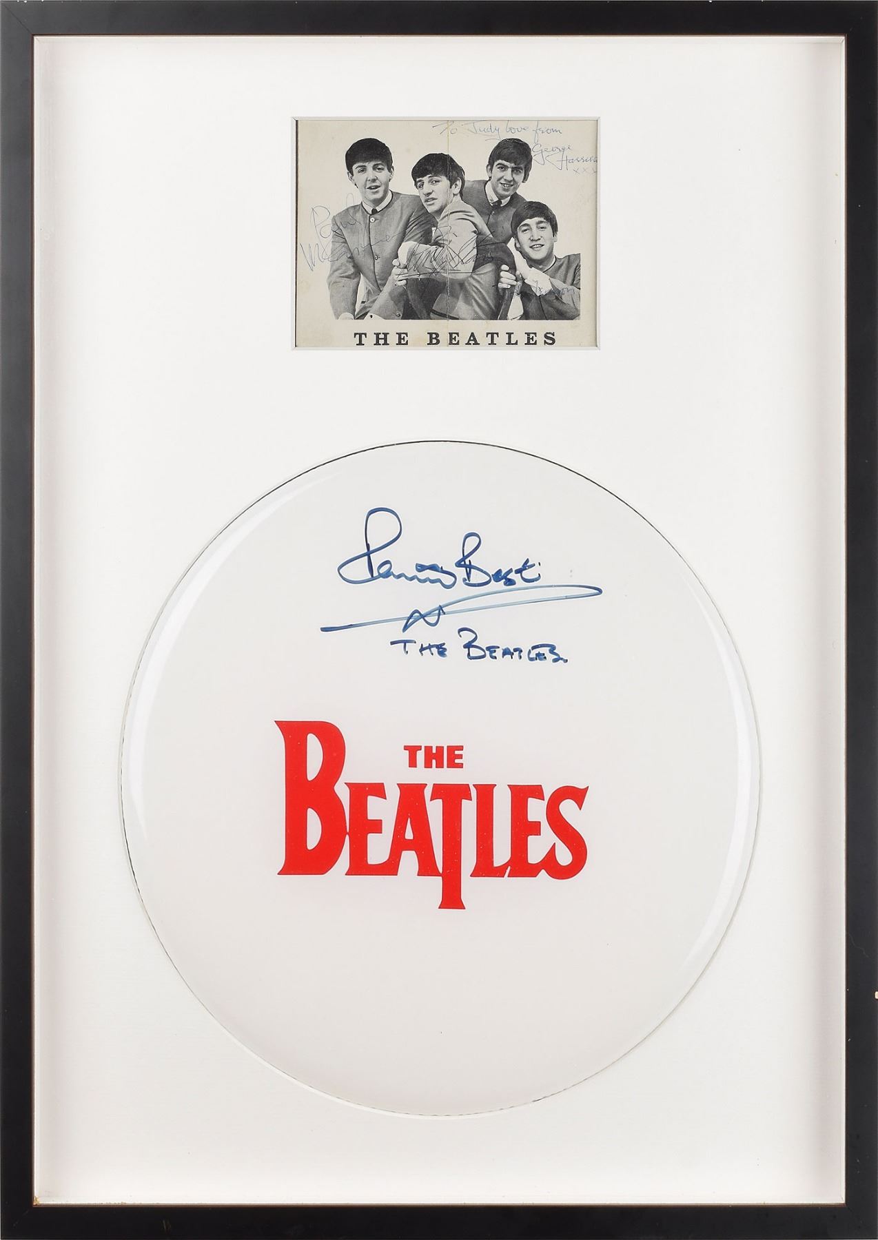 Highly desirable display featuring a vintage Beatles signed promo card and a drumhead signed by their original drummer, Pete Best, matted and framed to an overall size of 16.5 x 22. The vintage circa 1963 official Beatles Fan Club promo card features the classic Dezo Hoffman portrait of the band in their classic collarless suits, signed and inscribed on the front in blue ballpoint, "To Judy, love from George Harrison, xxx," "Paul McCartney," "Ringo Starr," and "John Lennon," with the reverse signed again by Harrison, "Thanks for your letter, George H." The drumhead is a modern white coated 12? drumhead with "The Beatles" in red lettering, signed in black felt tip, "Pete Best, The Beatles." The frame's backing has a window for viewing the reverse of the signed promo card. In very good to fine condition, with poor contrast to the Lennon signature, and a central vertical fold reinforced with old, toned tape on the reverse. A marvelous display boasting a grand total of five great Beatles signatures.