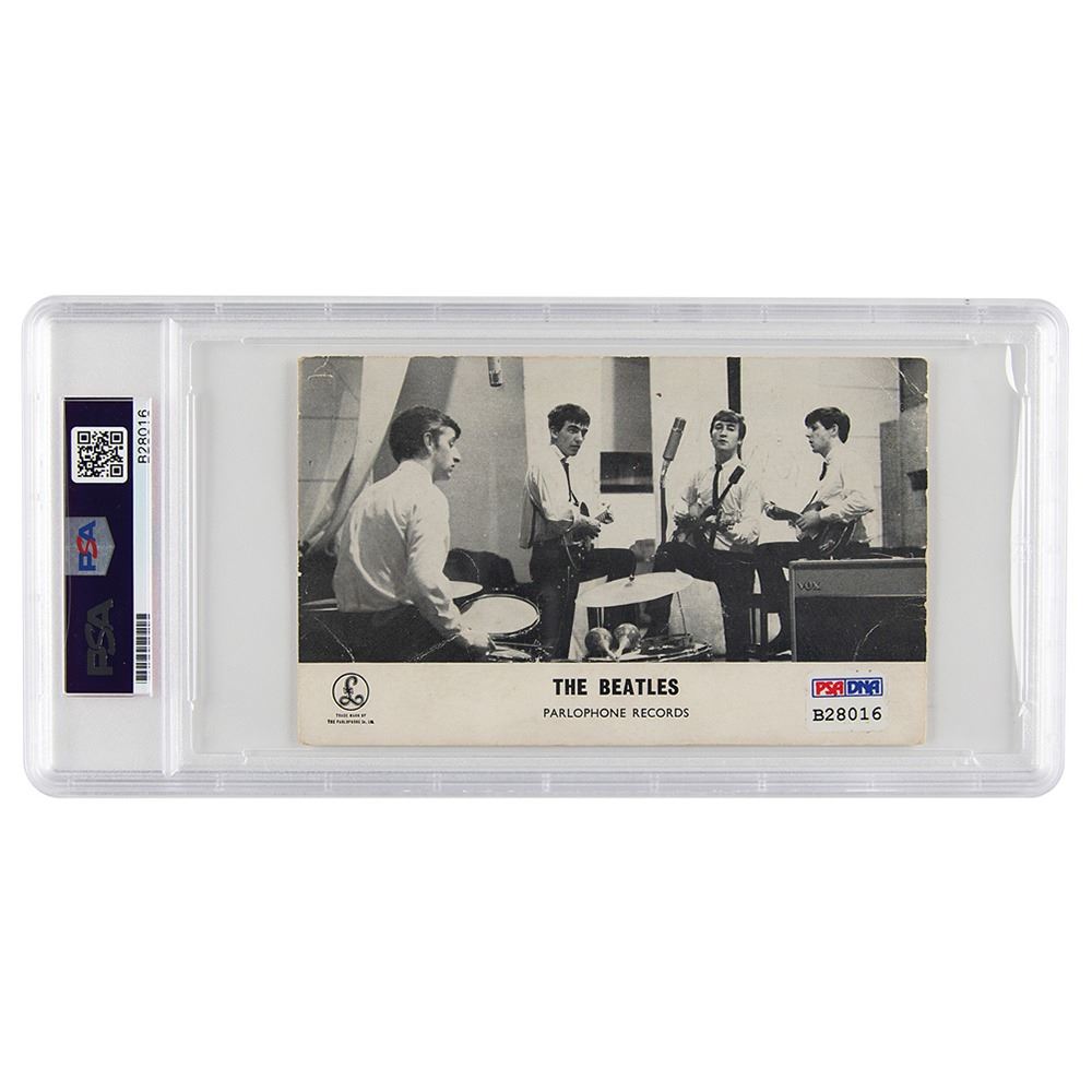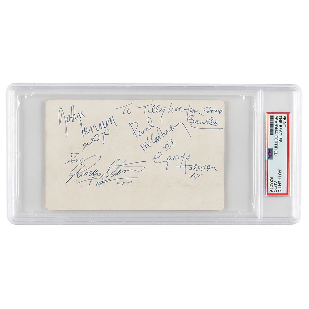 Desirable early Parlophone Records promo card of the Beatles during a recording session in the Abbey Road Studios, 5.75 x 3.5, signed and inscribed on the reverse in blue ballpoint, "To Tilly, love from some Beatles, George Harrison xx," "John Lennon xxx," "Love, Ringo Starr xxx," and "Paul McCartney xxx." In fine condition, with some light creasing and soiling. Encapsulated in a PSA/DNA authentication holder.