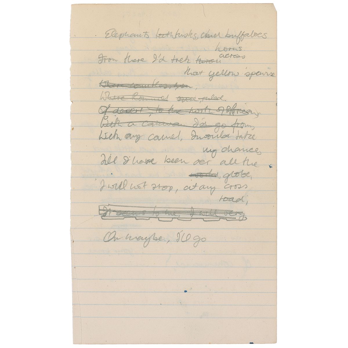 Scottish-born artist and musician (1940–1962) best known as the original bassist for the Beatles. Handwritten poem in pencil, unsigned, one lightly lined page, 4.5 x 7.25, no date but circa 1955. An untitled draft of a poem, in part: “With any camel, I would take my chances, / Till I have been oer[sic] all the globe, / I will not stop, at any cross road, / Or maybe, I’ll go.” In fine condition, with a uniform shade of mild toning. Accompanied by a letter of provenance stating that this was removed from a poetry book that was originally property of the Sutcliffe estate until sold at auction through Bonham’s.