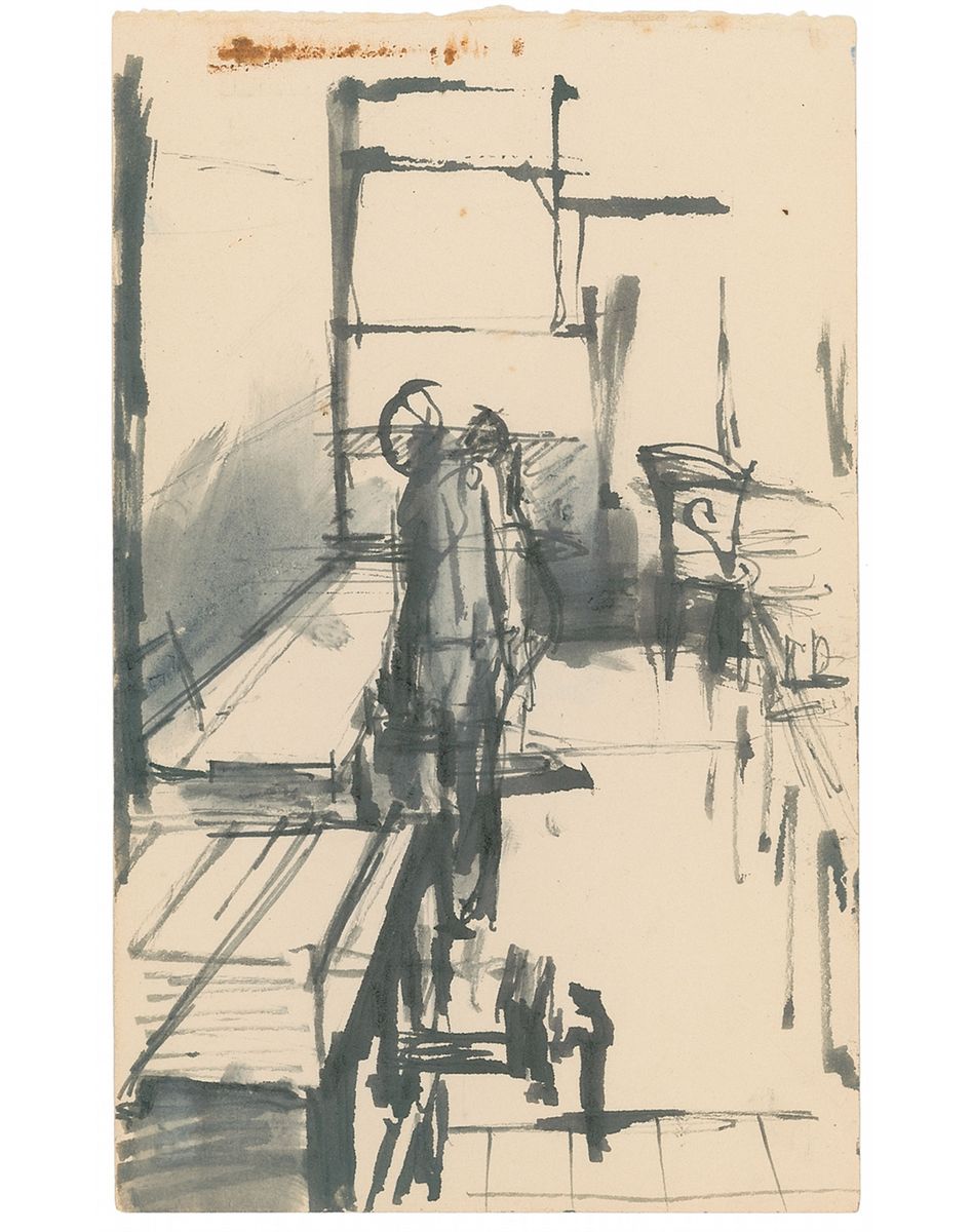 Scottish-born artist and musician (1940–1962) best known as the original bassist for the Beatles. Wonderful original black watercolor painting by Sutcliffe on an off-white 4.25 x 7 sheet of sketchbook paper, no date but circa 1960, showing a figure standing inside a room. In fine condition, with a stain at the top edge. Accompanied by a letter of provenance stating that this was removed from a sketchbook that was originally property of the Sutcliffe estate until sold at auction through Bonham’s. The sketchbook this was taken from was used by Sutcliffe while studying at the Liverpool College of Art, during which time he shared a flat with John Lennon.