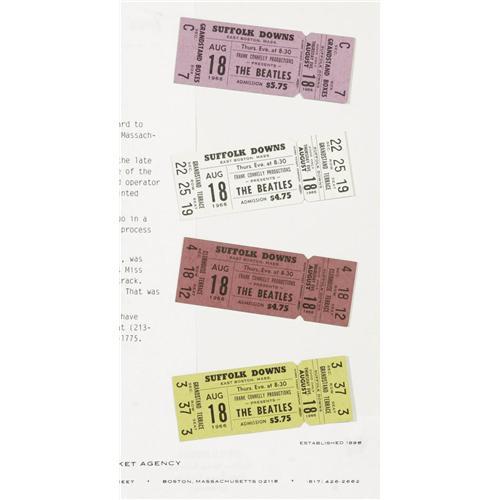 <B>Beatles Suffolk Downs Unused Tickets Set of 7.</B></I> Featured are seven unused, color-coded tickets for the Beatles August 18, 1966 concert at the Suffolk Downs racetrack in East Boston, Massachusetts. Large portions of the 25,000-seat venue were cordoned off and not sold, resulting in a number of unused tickets, a number of which were discovered in the attic of concert promoter Gerald Roberts in 1984. The lot includes one each of a pink Clubhouse Box ticket, burgundy Clubhouse Terrace ticket, blue Grandstand ticket, purple Grandstand Boxes ticket, brown Grandstand Mezzanine ticket, white Grandstand Terrace ticket, and yellow Grandstand Terrace ticket. All are in excellent condition, framed along with letters of provenance from Roberts and box office treasurer Harold Bloom.