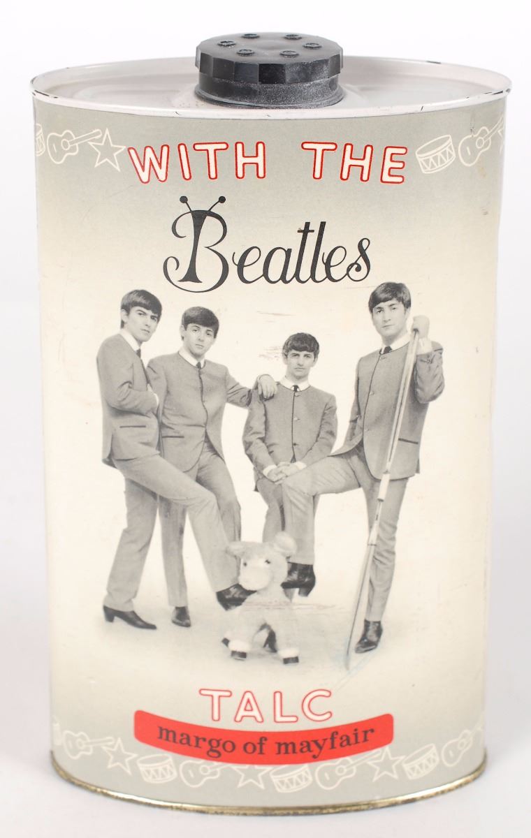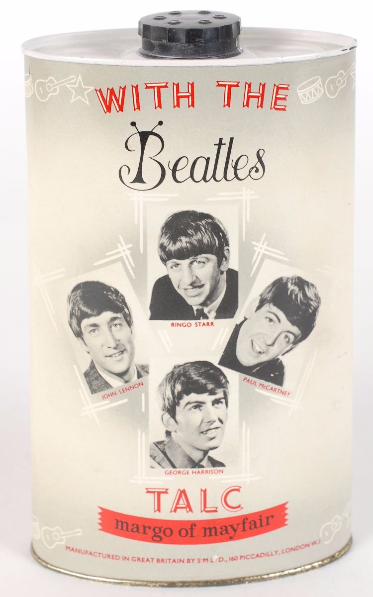 Vintage Margo of Mayfair talc power tin container with printed group images of the Beatles on both sides and headed at the top, “With the Beatles,” measuring 4.5 x 7.5, manufactured by S. M. Limited of London. Embossed on the bottom, “Made in England.” In fine condition.