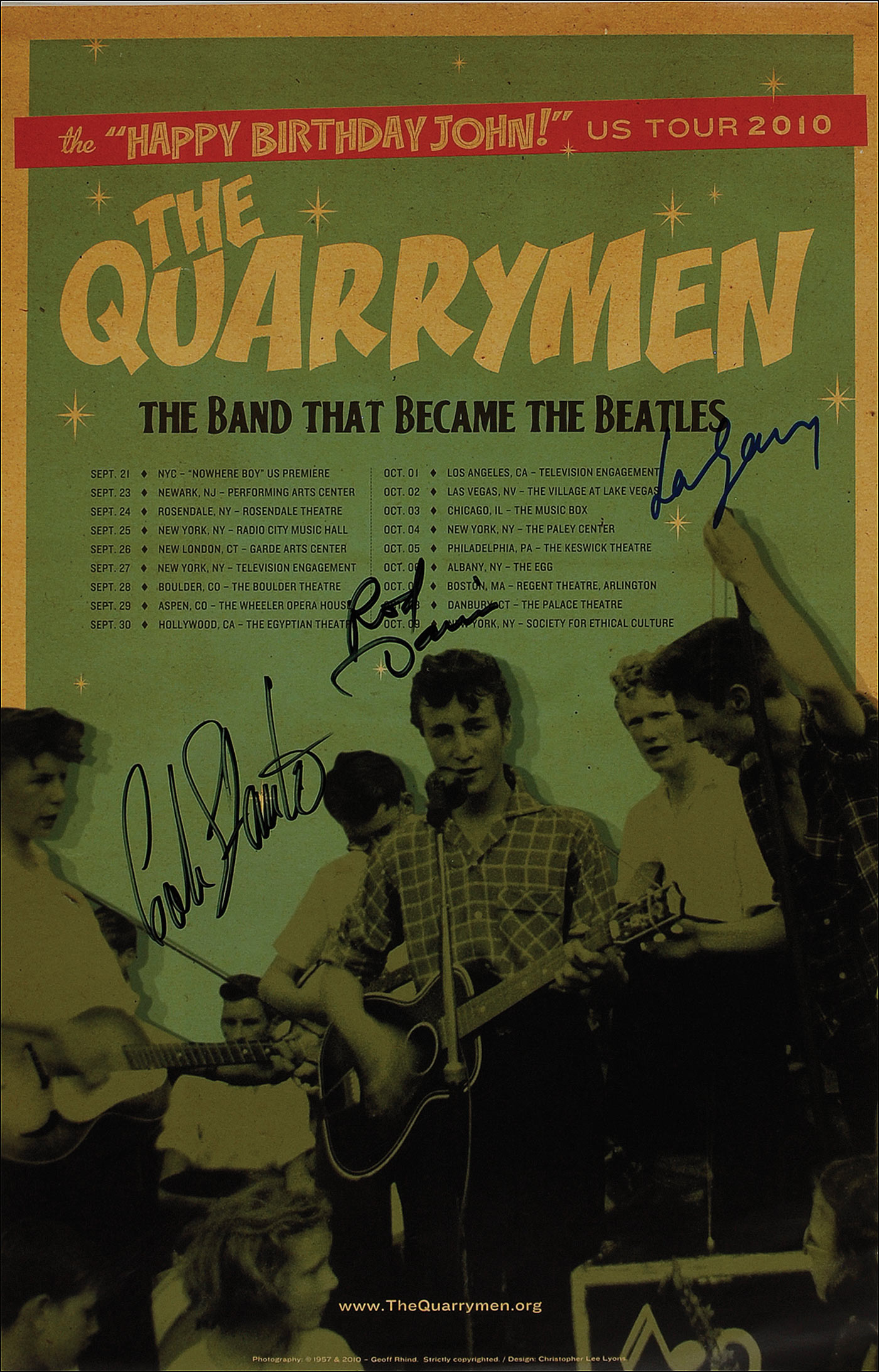 Color 11 x 17 mini-poster for their Happy Birthday John 2010 US Tour, signed in black felt tip by Rod Davis and Colin Hanton, and blue felt tip by Len Garry. In fine condition. Accompanied by a full letter of authenticity from Roger Epperson/REAL.
