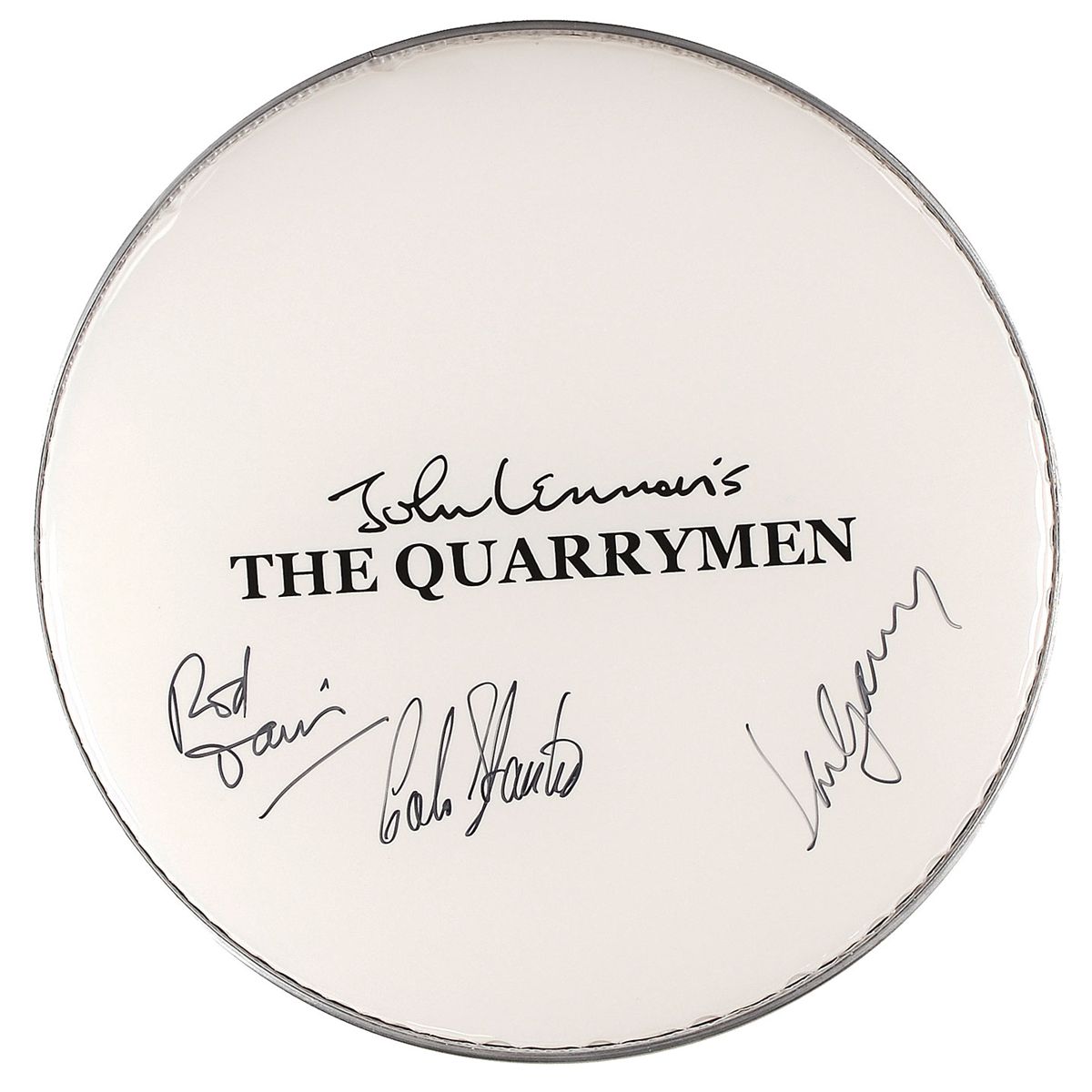 Unused 13? off-white drumhead, with “John Lennon’s The Quarrymen” affixed to the center, signed in black felt tip by Rod Davis, Colin Hanton, and Len Garry. In fine condition.
