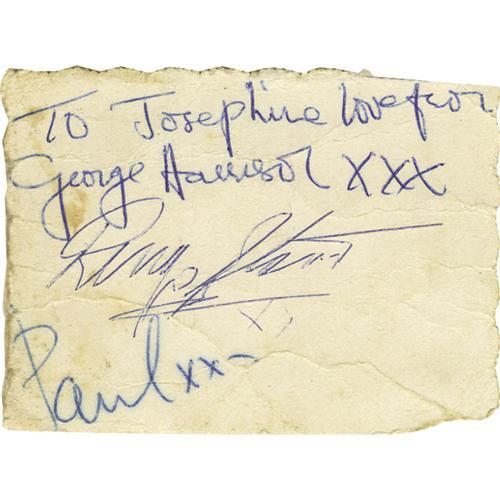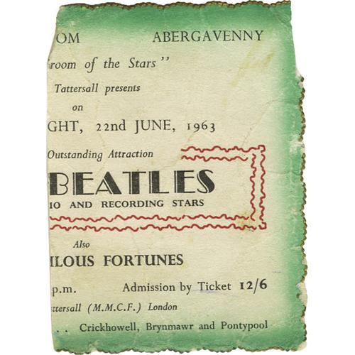 <B>Beatles Ticket Stub with Autographs.</B></I> From a June 22, 1963, performance, with a second piece signed by Paul McCartney, George Harrison, and Ringo Starr in blue ink. The item dates from the period when Beatlemania was gaining momentum; the band would stop doing live concerts in 1966, working together as a group primarily for recording sessions until August, 1969 -- making group-signed items such as this hard to find. In Very Fine condition with mild overall wear. <I>Accompanied by LOA from PSA/DNA.</B></I> <I>Accompanied by LOA from PSA/DNA.</B></I><BR><BR><b>Shipping:</b> Flat Material, Small (<a target="_blank" href="http://www.heritageauctions.com/common/shipping.php">view shipping information</a>)