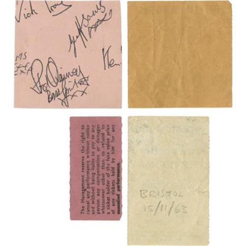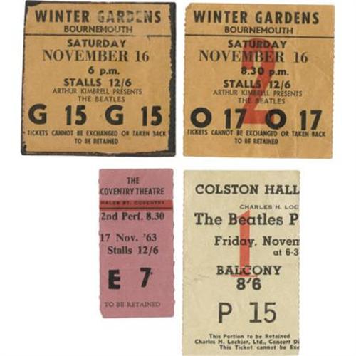 <B>Beatles Ticket Stubs, Group of 4.</B></I> Included are used tickets for the following Beatles performances: Bristol, November 15, 1963; Winter Gardens, November 16, 1963 (two); and the Coventry Theatre, November 17, 1963. Items are in overall Fine to Very Fine condition with some instances of moderate to heavy creasing.<BR><BR><b>Shipping:</b> Flat Material, Small (<a target="_blank" href="http://www.heritageauctions.com/common/shipping.php">view shipping information</a>)