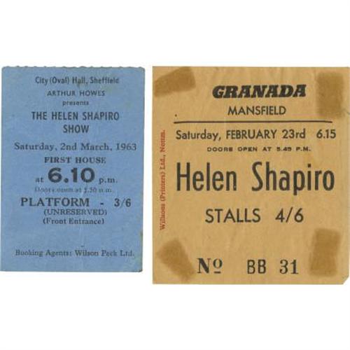 <B>Beatles Ticket Stubs, Group of 2.</B></I> Included are used tickets for the Beatles performances with Helen Shapiro at the Granada on February 23, 1963, and at the Sheffield City Hall on March 2, 1963. Items are in overall Fine to Very Fine condition with tape residue to the former and a heavy crease to the latter.<BR><BR><b>Shipping:</b> Flat Material, Small (<a target="_blank" href="http://www.heritageauctions.com/common/shipping.php">view shipping information</a>)