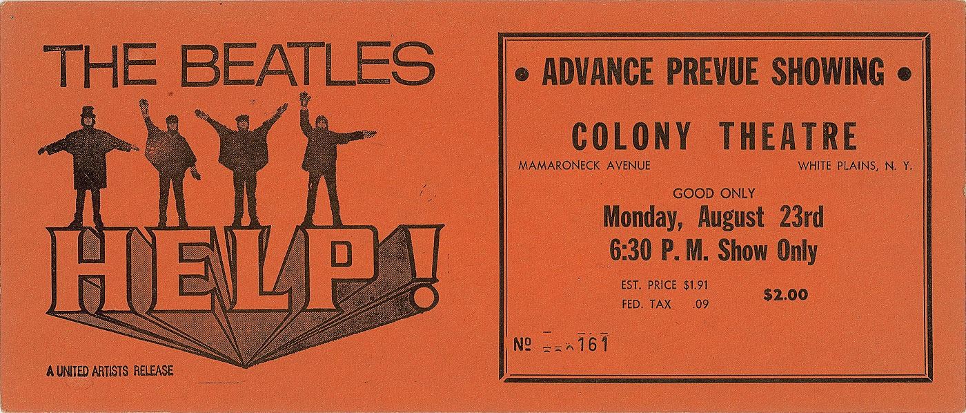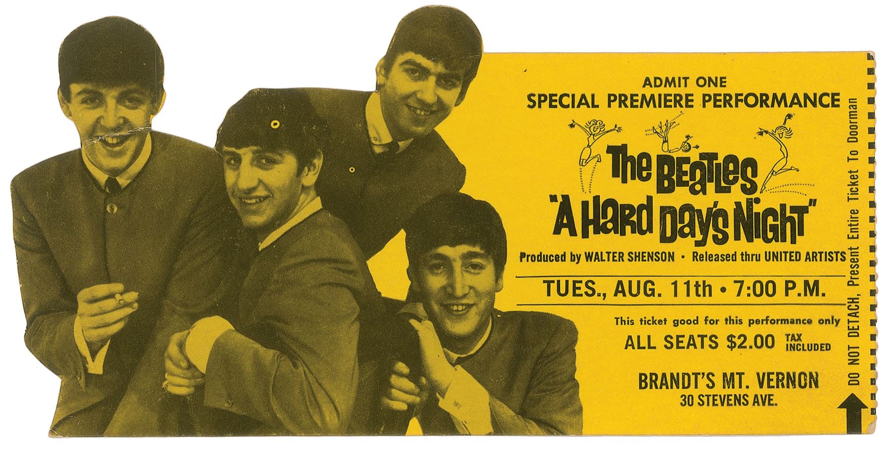 Vintage pair of large Beatles movie tickets: an orange ticket for an "Advance Prevue Showing" of the Beatles' second feature film, Help!, at the Colony Theatre in New York, no. 161, August 23, 1965, 8.75 x 3.75, depicting the group and film logo on the left side; and a yellow ticket stub for a "Special Premiere Performance" of the Beatles' debut feature film, A Hard Day's Night, at Brandt's Mt. Vernon on August 11, [1964], 7.5 x 3.75, showing the band in their matching suits. In overall fine condition, with a crease across Paul's face.