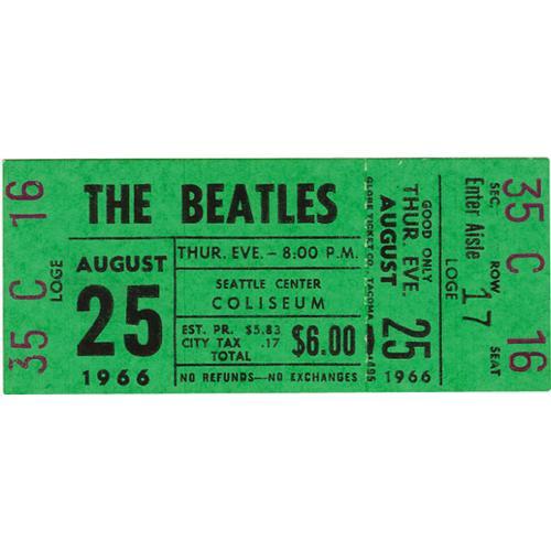 <B>Beatles Unused Seattle Coliseum Concert Ticket.</B></I> An unused ticket to the Beatles' sold-out August 25, 1966, evening performance at the Seattle Center Coliseum. In Very Fine to Excellent condition with mild wear and soiling, and some looseness along the perforation area.<BR><BR><b>Shipping:</b> Small Flat (<a target="_blank" href="http://www.heritageauctions.com/common/shipping.php">view shipping information</a>)