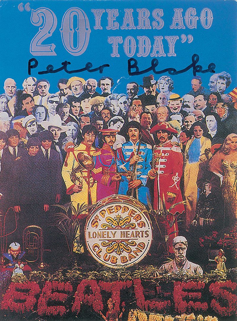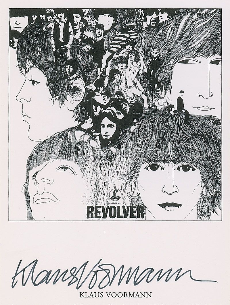 Color 4.5 x 6 postcard featuring the Sgt. Pepper’s album cover, signed in black felt tip by Peter Blake; and a 4 x 5 cardstock photo of the Revolver album cover, signed in black felt tip by Klaus Voormann. In overall fine condition, with lower edge of the Revolver photo apparently trimmed.